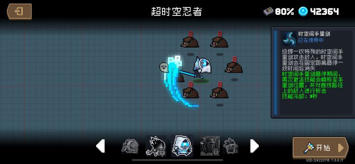 角色:超时空忍者血量:5(不变)护甲:5(不变)能量:210(不变)暴击:10(由原先的5改成10毕竟忍者都是10)勇斗值:30(这个是我特意加的可以参考剑宗的剑意值)被动:每隔一段时间对周围敌人进行踢击期间无敌(期间无敌是我新加的原因之前太鸡肋了)主动技能:可以参考文图片(图一)大致就是由原先的扔出一枚飞镖变成扔出三枚小飞镖并在最终位置合体成一枚大飞镖并在固定位置悬停一段时间消失,