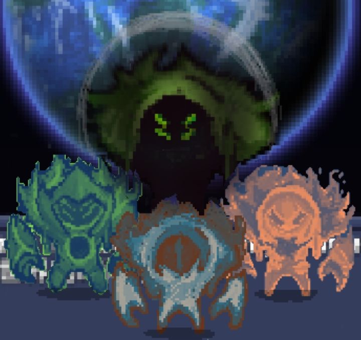 『审判者』 Boss(霞光之都) 『被囚禁在霞光之都能源供应中心的超次元矩阵内,为霞光之都提供着无尽能源,击败真红后,与真红象交互可以得知其信息,并且可以选择是否前往』 【在击败三位审判者之后,一位隐藏的敌人将被揭示。合理的牵制boss移动,可以减轻对战压力】 ●他们是三个独立的boss ○噬元凶灾·毁灭魔像(绿):“作为现实的生命亵渎者,他代表了宇宙中的所有转变,他会审判那些他认为值得