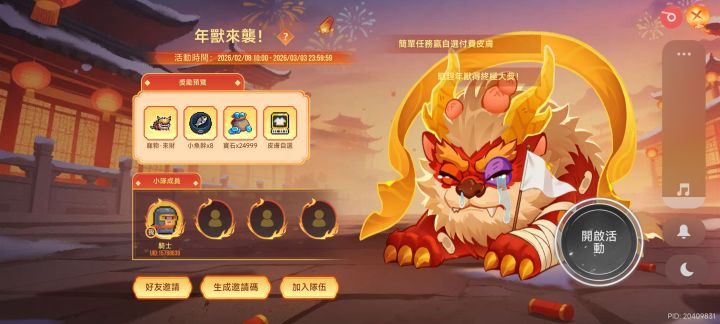 炮仗已备齐,就差你了!队伍ID: NBm2e92J0EX6i8。噼里啪啦,年兽退散!