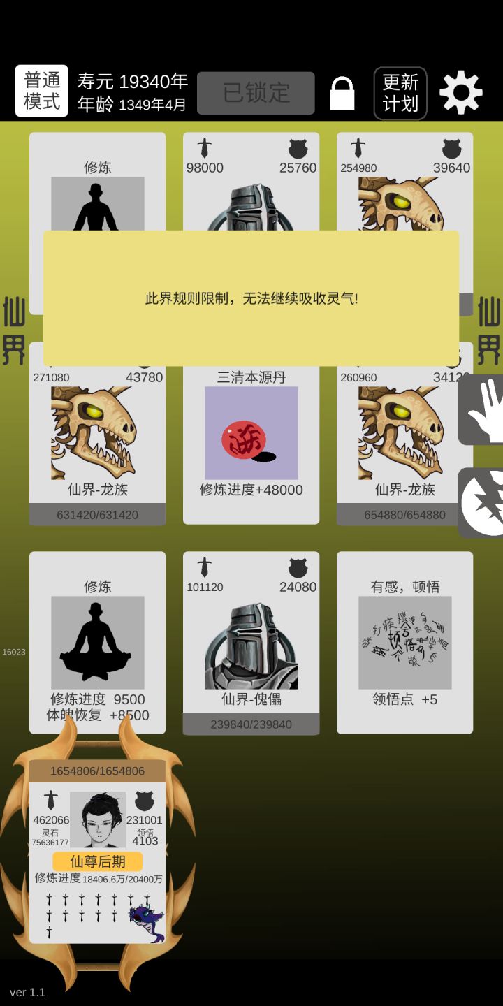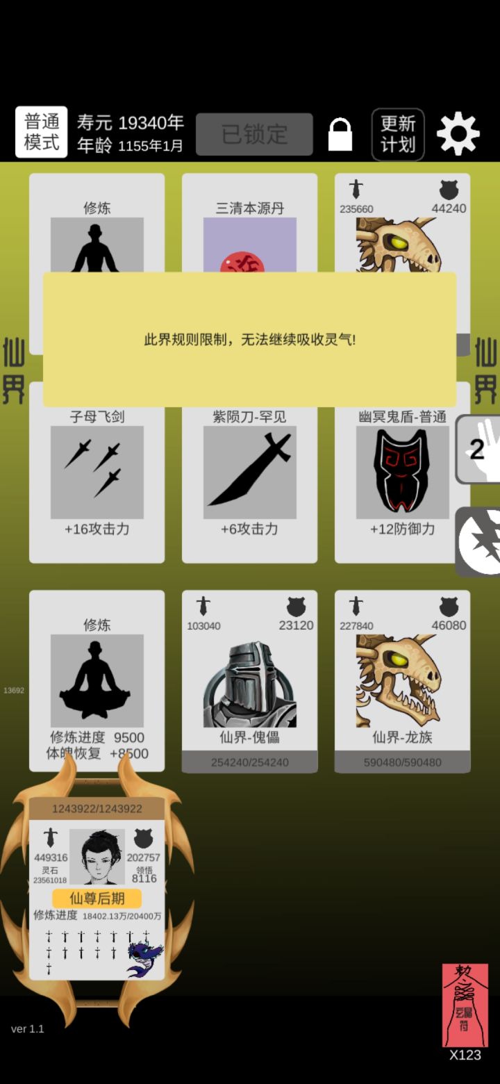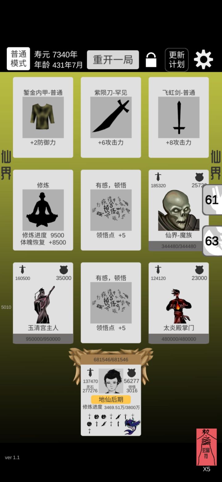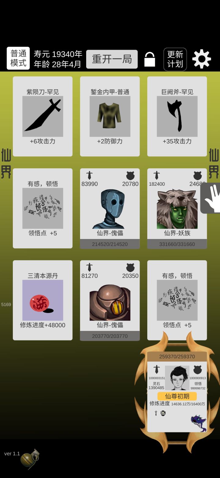 终于普通版通关了。感觉前一千关加攻击比较好,因为轮回点加10%其他的加的不多,挂掉的原因手快因素比较大。渡劫后期要抓紧打怪刷钱,不然没符很难过。到仙界就无敌了,怪攻击比渡劫期都低。一张是刚到仙界的图,一张是放通关的图,可以无限刷,只是不加修为,秘境可以加属性!大家加油1。忘了说我选的是体魄!