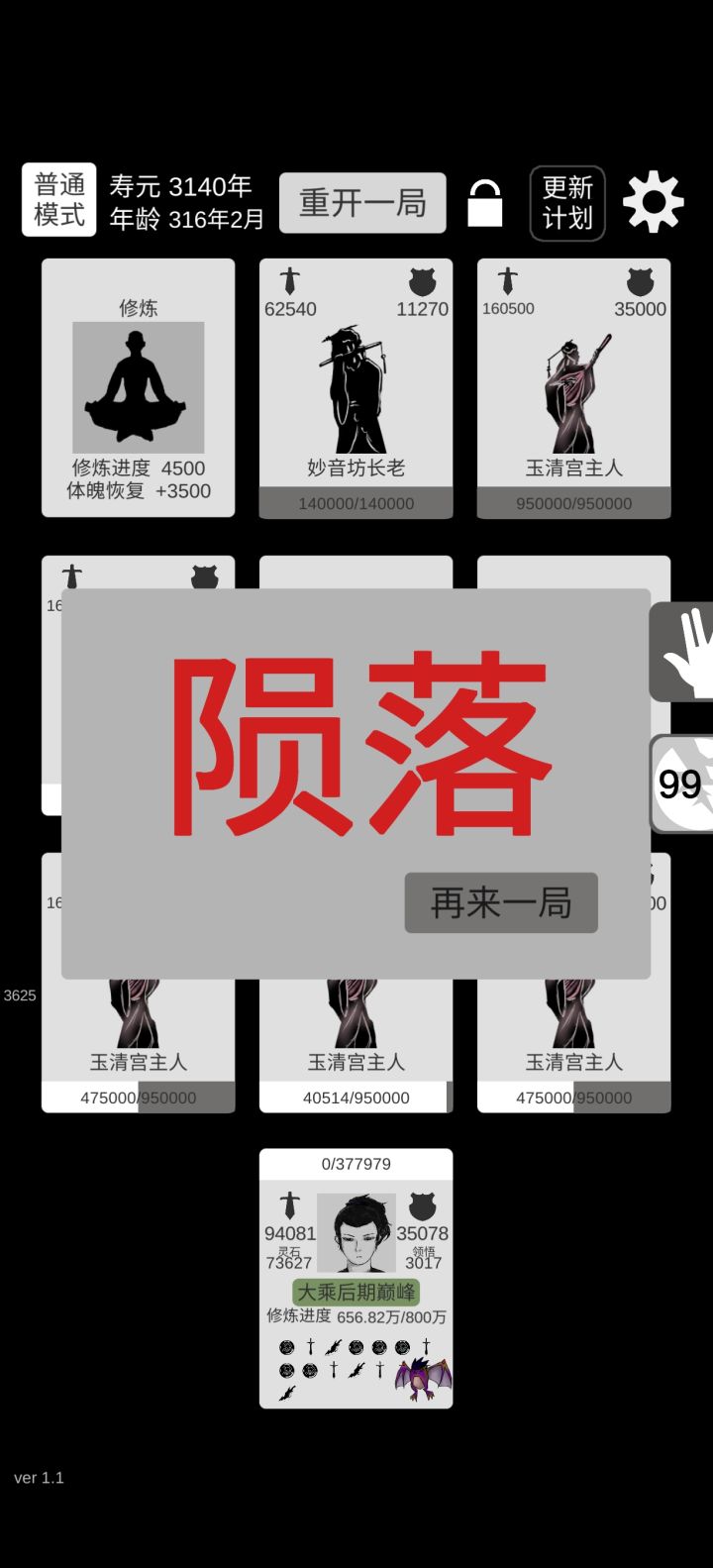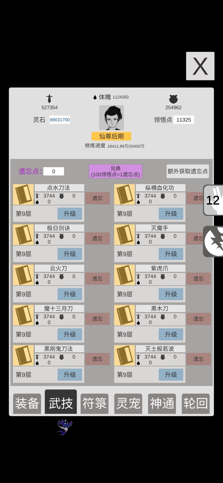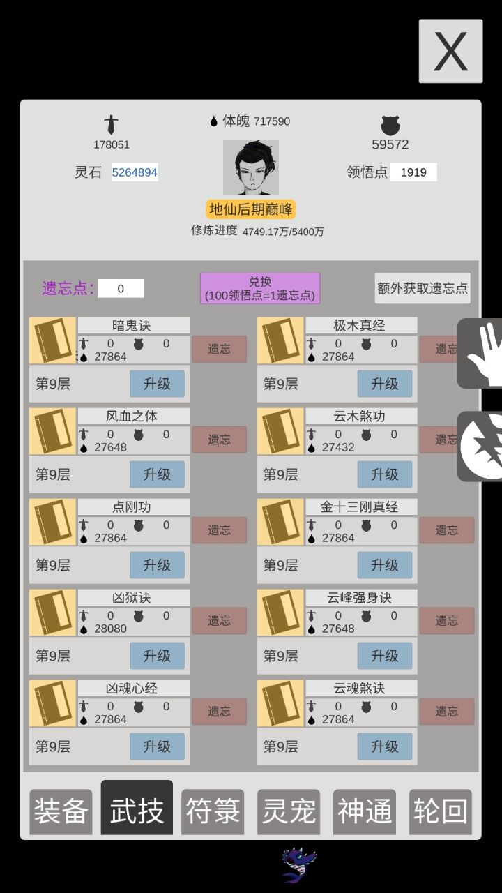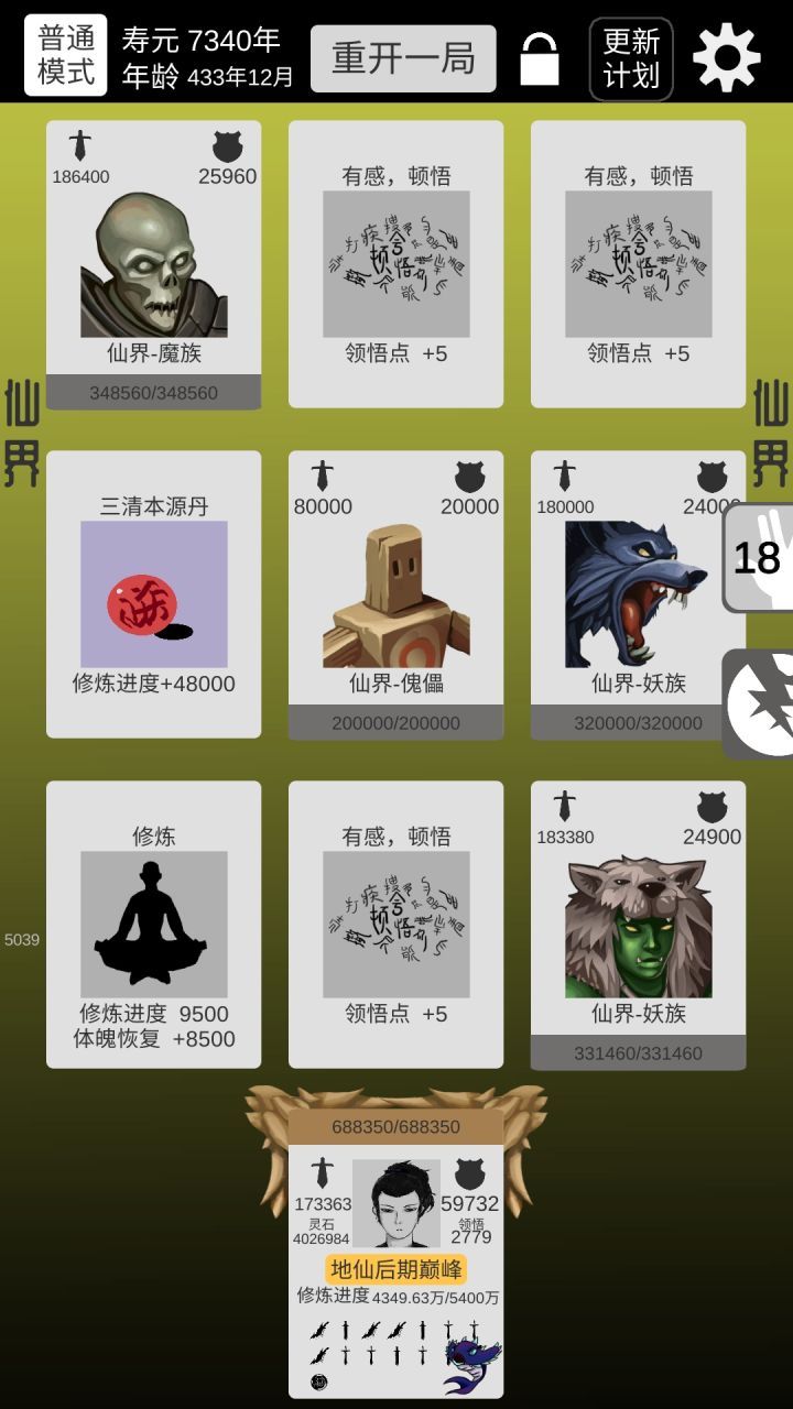 终于普通版通关了。感觉前一千关加攻击比较好,因为轮回点加10%其他的加的不多,挂掉的原因手快因素比较大。渡劫后期要抓紧打怪刷钱,不然没符很难过。到仙界就无敌了,怪攻击比渡劫期都低。一张是刚到仙界的图,一张是放通关的图,可以无限刷,只是不加修为,秘境可以加属性!大家加油1。忘了说我选的是体魄!