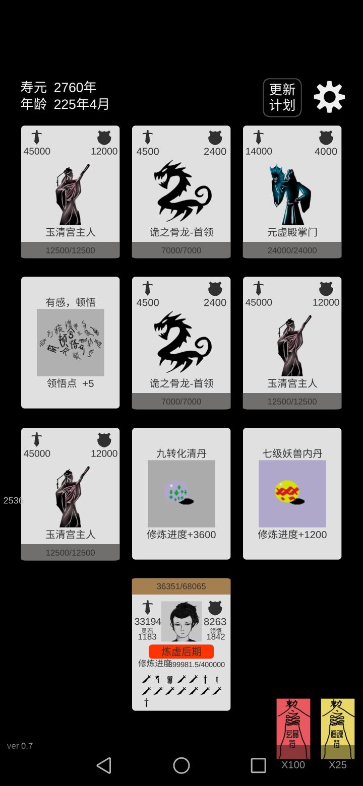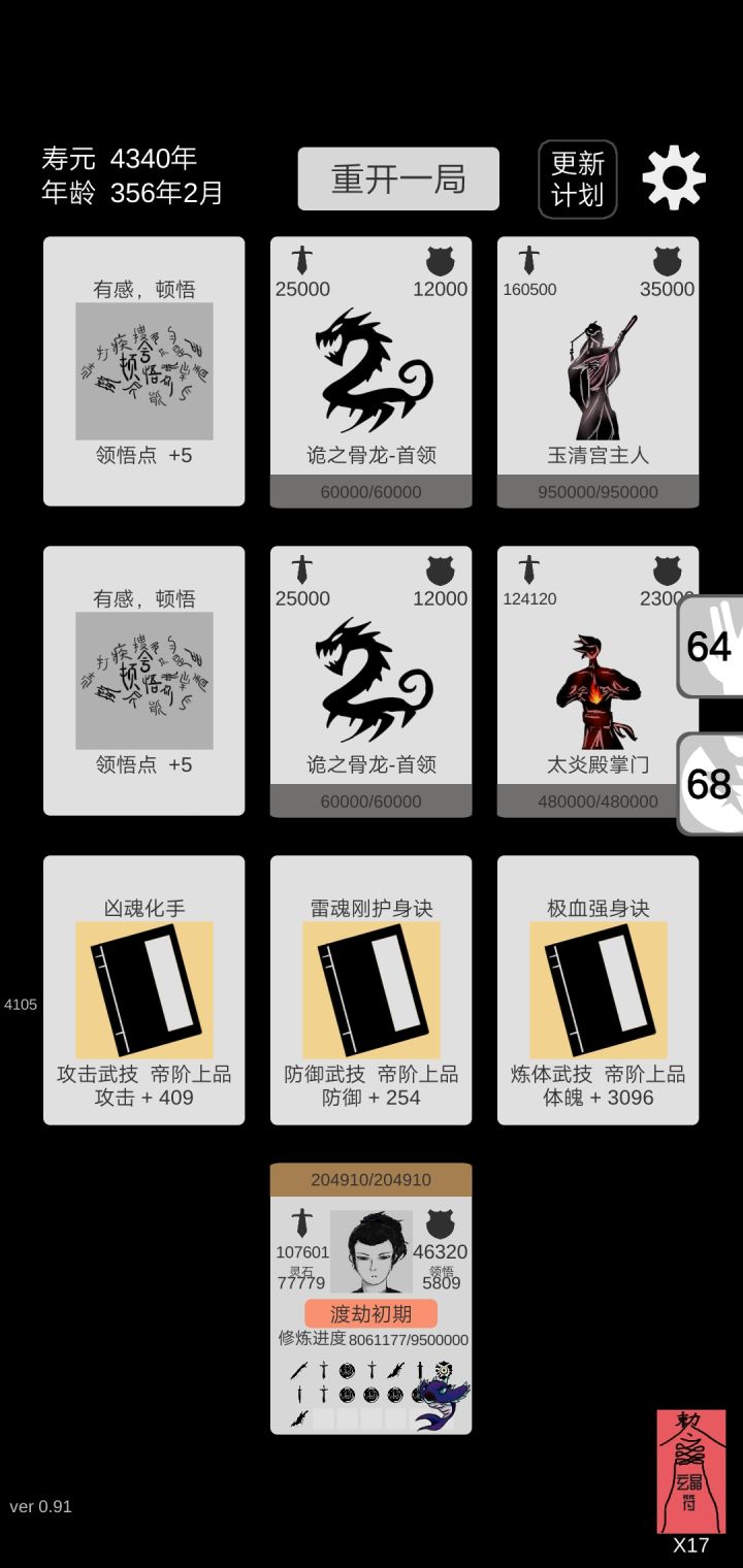 上限还是太低了,更新后我又玩了一把,武技全帝阶上品满级,人皇剑什么的都满了,到了一定层数以后依然被小怪碾压,符箓也都扔完了依然死局,再重开一局重头再来也没什么意义,提个建议,可以增加转生玩法,比如根据死亡时的层数给予一定转生值,升级转生等级增加开局属性什么的,武技可以突破,消耗灵石什么的,或者装备可以强化啊,加入技能系统什么的
