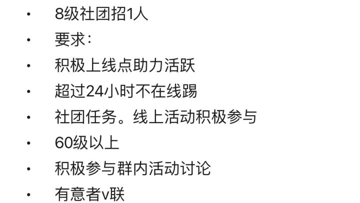 9级社团招一人,无等级要求◯要求日活跃高的:包括每日勤助力,积极完成白羽(保证每周三轮都可以开)◯团体活动不求名次,但也能积极完成