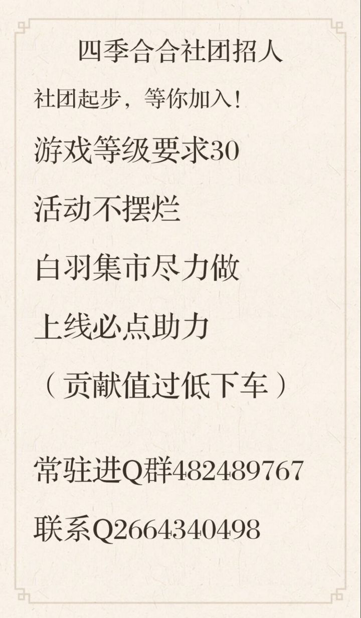 目前2级,等待常驻一起成长!希望社员常常上线互助体力,白羽集市常开,能做尽力做,没有要求注意注意:周贡献值过低会请下车哦!!!#四季合合 #四季合合求大佬带飞