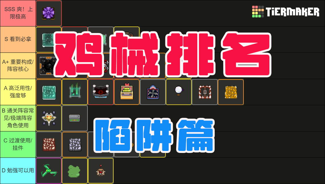 Hello 各位指挥官们!这次让我们继续带来【陷阱类】鸡械的排名以及使用指南!众所周知,炮台是正面的重拳,守卫是坚实的盾牌,那么陷阱就是藏在阴影中的绊索与尖牙。话不多说,让我们一起看看如何在敌人必经之路上,设下它们最讨厌的东西吧!往期回顾: 小编PS:战场局势瞬息万变,上述排名仅供参考特别鸣谢:良宵哥【重要定义】SSS:真神,上限极高,通关爽度极高S:成形爽度高,强度高,泛用性高,