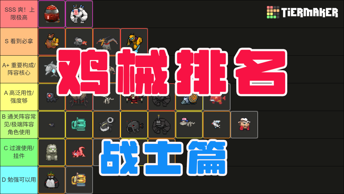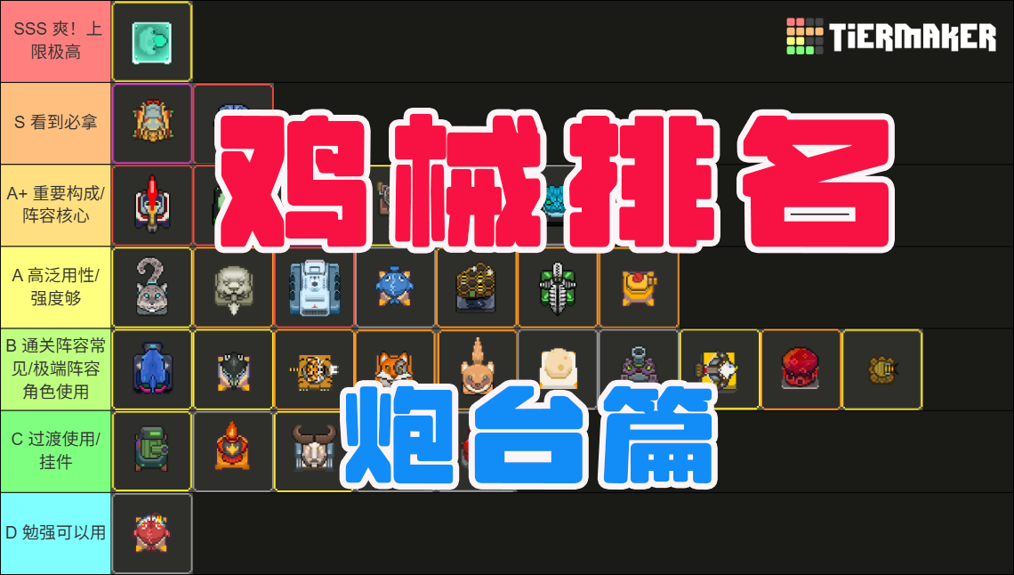 为了帮助各位新晋指挥官们在茫茫多的鸡械中,挑选中合适通关的鸡械,此次工程狮特地指派本人帮助大家以【泛用性】、【阵容适用性】、【性价比】、【成型难易度】、【成型爽度】、【获取爽度】等,作为主要评分标准来做出了鸡械排行,希望可以带给指挥官一些不同的分析角度!话不多说,让我们直接开始!特别鸣谢:良宵哥 小编PS:战场局势瞬息万变,上述排名仅供参考【重要定义】S