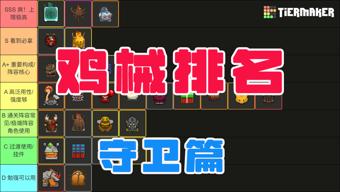 Hello 各位指挥官们!不知道上篇【炮台类鸡械排名&使用指南】是否为大家带来了一些不同的战场升级思路呢?这次让我们继续开整我们的【守卫】篇!众所周知,塔防游戏中的守卫往往起到了承担伤害以及防御阵线的作用,那么如何在众多守卫类鸡械中挑选出最适合当前阵容,同时又能高效防御阵线的守卫类鸡械呢?本次守卫类鸡械的排名维度将以【防守维度】和【功能维度】同时搭配【泛用性】、【阵容适用性】、【性价比】、【成