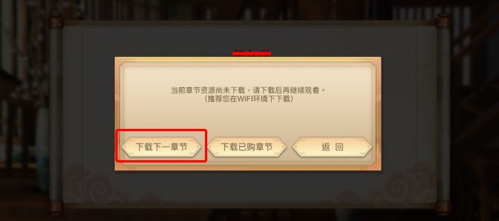 打开《少年歌行互动版》第三章,需要先通关第二章,通关第二章之后点击开始下一章节,会提示需要下载资源,点击【下载下一章节】。等资源下载完成之后,再从第二章的结尾重新进入。