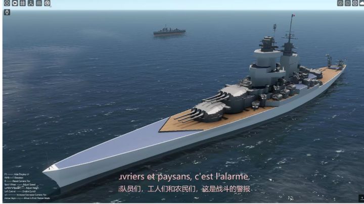 背景:法兰西公社尺寸:水线长290m宽39m,排水量70000t时吃水11m动力:四轴共240khp,70kt排水量下航速33.2kn武器:三座三联17in,3座三联6in,12座双联100mm,14座双联57mm防护:主装420/390mm,装甲甲板210/190mm,内层防崩落穹甲50/40mm,艏穹甲50/40mm,艉穹甲120/100mm,艏艉次装60mm背景音乐:Le chan