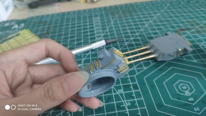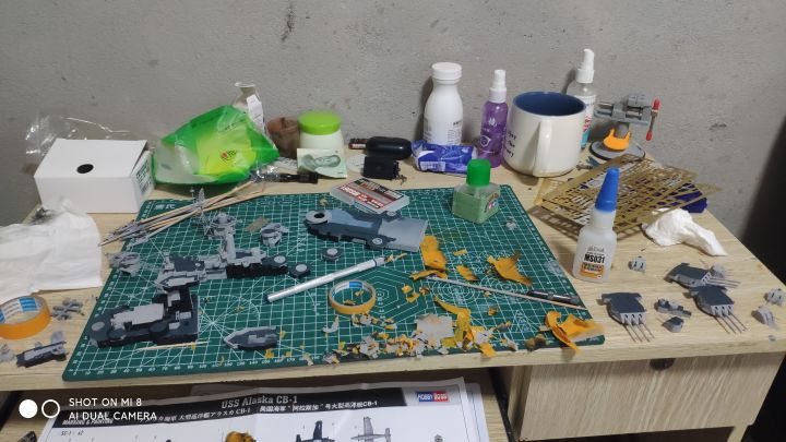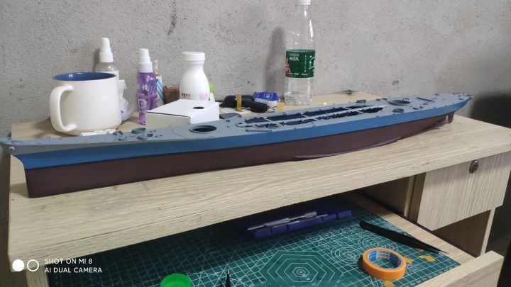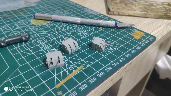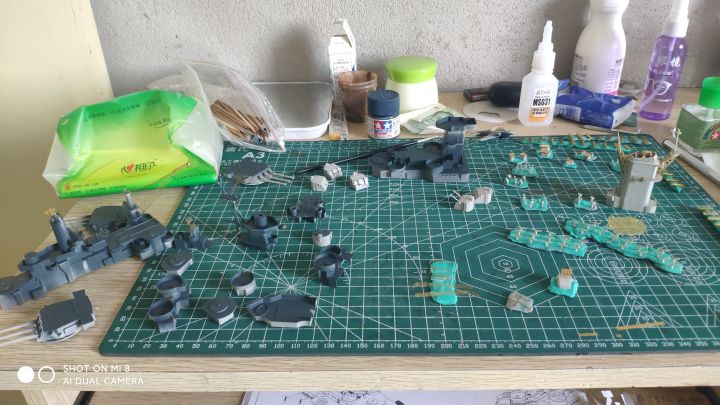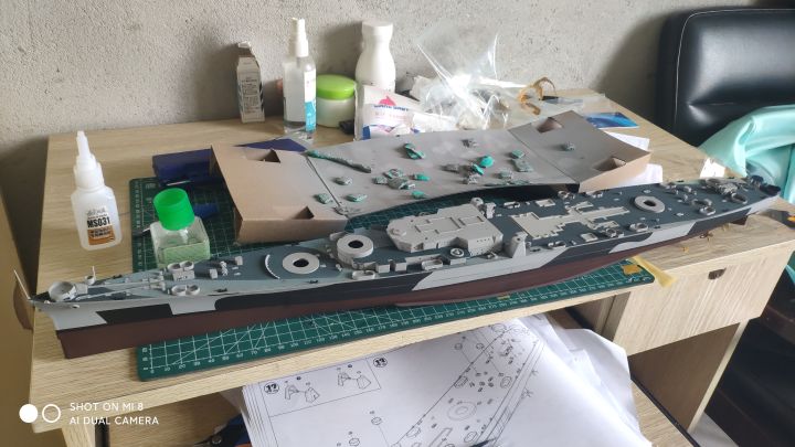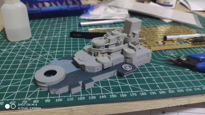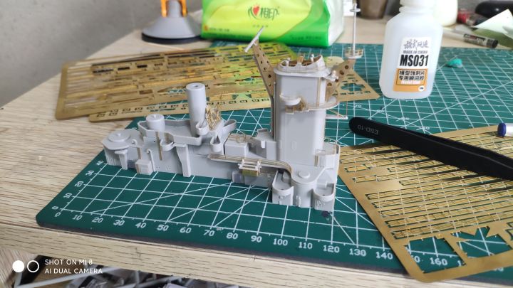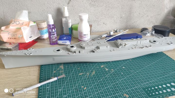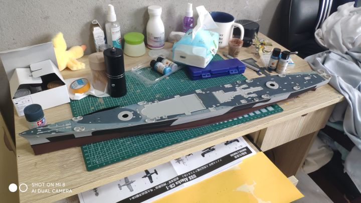 继上篇之后,考试考完了,我也放假了,复工开干,现在完成度已经很高了,主要是还差防空炮以及部分设备,涂装比较头疼,左右不对称,而且遮盖也非常麻烦,更要命的是现在我没油漆了。防空炮实在没钱换打印件了,只能用号手原版的了,效果不太好,而且也比较肉,自己会狠狠的打磨打磨(号手这个蚀刻片怎么说呢,量是非常足的,不上改也有比较好的效果,缺点就是太硬,基本都是大光板,没有什么细节,弹射器滑轨连个防滑纹都不愿意