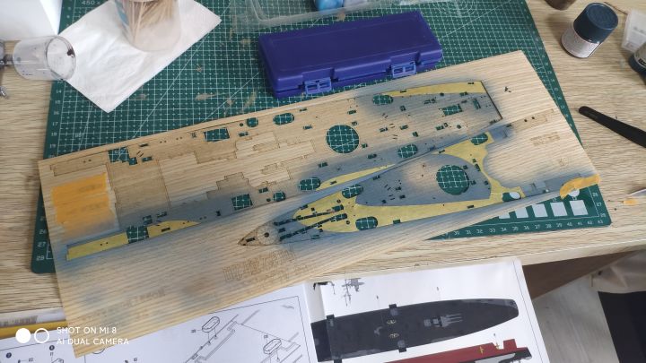 吳港已于昨日開工,後續工程實時更新模型步驟:①開模 將零件從板子上裁下來然後打磨乾淨合模線和水口,有缺損的地方用補土(一種粘稠狀的塑料膠,遇空氣后硬化)修補②假組 按照說明書進行組合,觀察擬合程度,可以后拆下來,保留一組一組的單個零件③加改件 加入金屬蝕刻片(手最痛的時候)替換原件,原件需要打掉。鋪設木甲板④上遮蓋 為上色做準備工作,由於是用噴槍作業,一次只能大面積噴塗一個顏色,需要依次