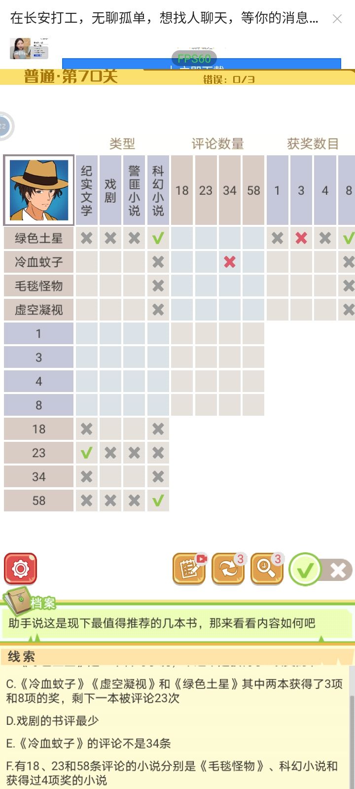 前面好多次分别都是一对一,怎么这里就矛盾了,虽然最终解出来了,但游戏体验很不好,希望开发者能在出题前把所有线索理一遍第一个线索说纪实文学有23评论,最后一个线索又说科幻小说有23评论,给我整不会了