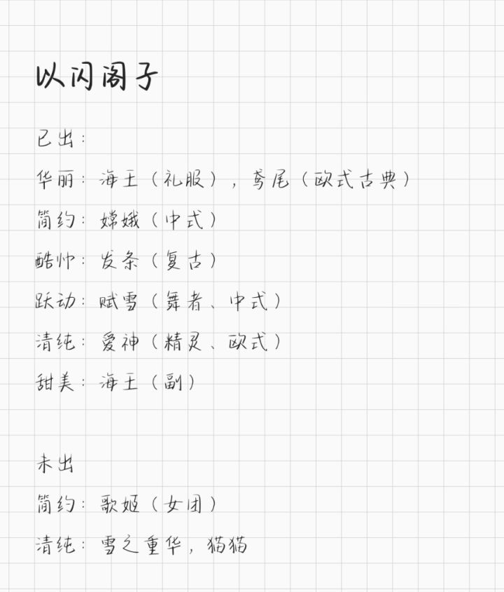 因为有点缺一些属性就小小盘了一下国服已出的限时六星和没有轮到的六星海王好像我看华丽和甜美好像都有(?)所以甜美标了个副美美攒钻等新年阁和歌姬了www如果新年出新限定阁的话希望歌姬不会在新年阁前后排上如果有什么不对的地方希望大家指出谢谢