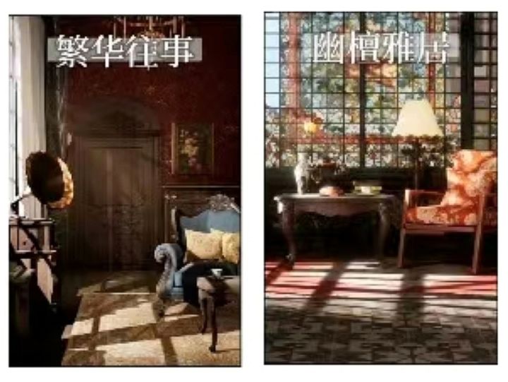 (建议仅供参考,是否购买请以个人喜好为准!!!)7.民国、复古以下背景排序不分先后顺序繁华往事:不推荐,暖色打光,动态动作不错,静态动作一般,适合民国大小姐、夫人、贵妇穿搭早期背景所以建模少,左边的窗外景开全景也比较塑料,不影响屋内观感,作为一个民国风背景还是不错的,可惜的是没有什么亮点,喜欢民国风可以入。幽檀雅居:推荐,暖色打光,适合暖色系穿搭,动态动作不错,静态动作一般,亮点是花窗,拍