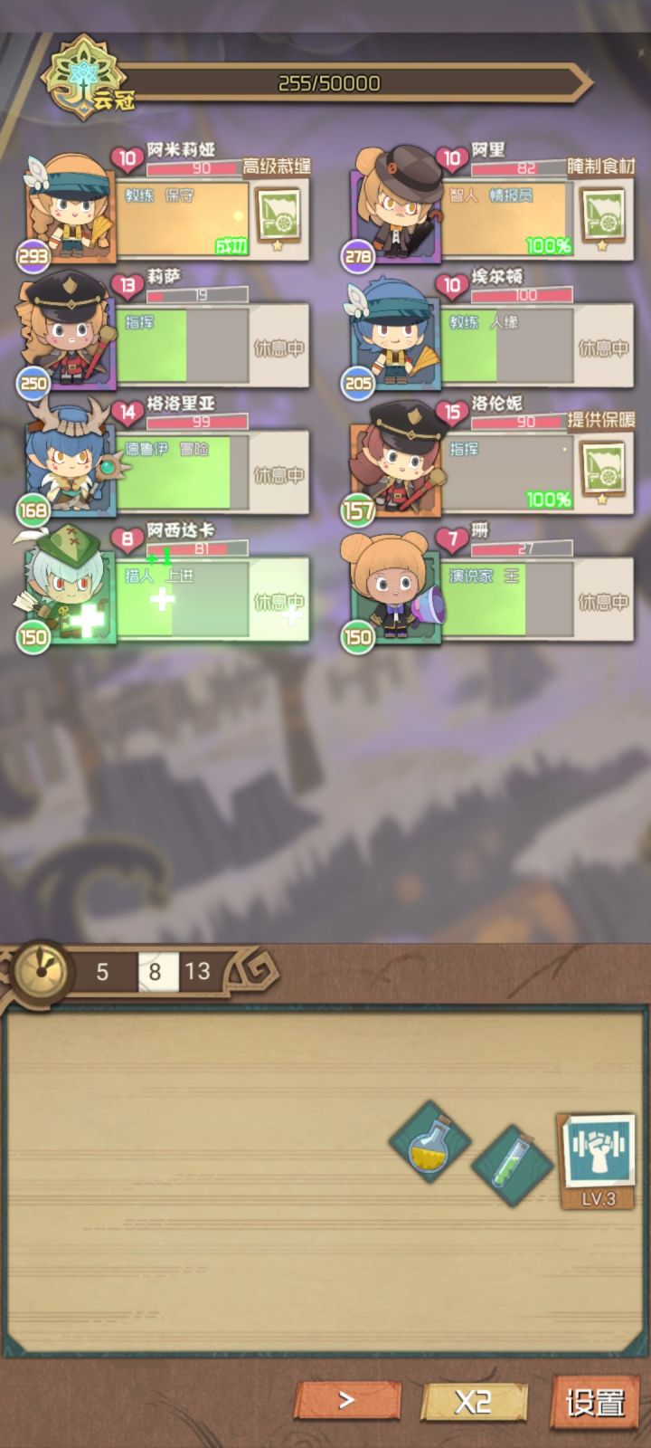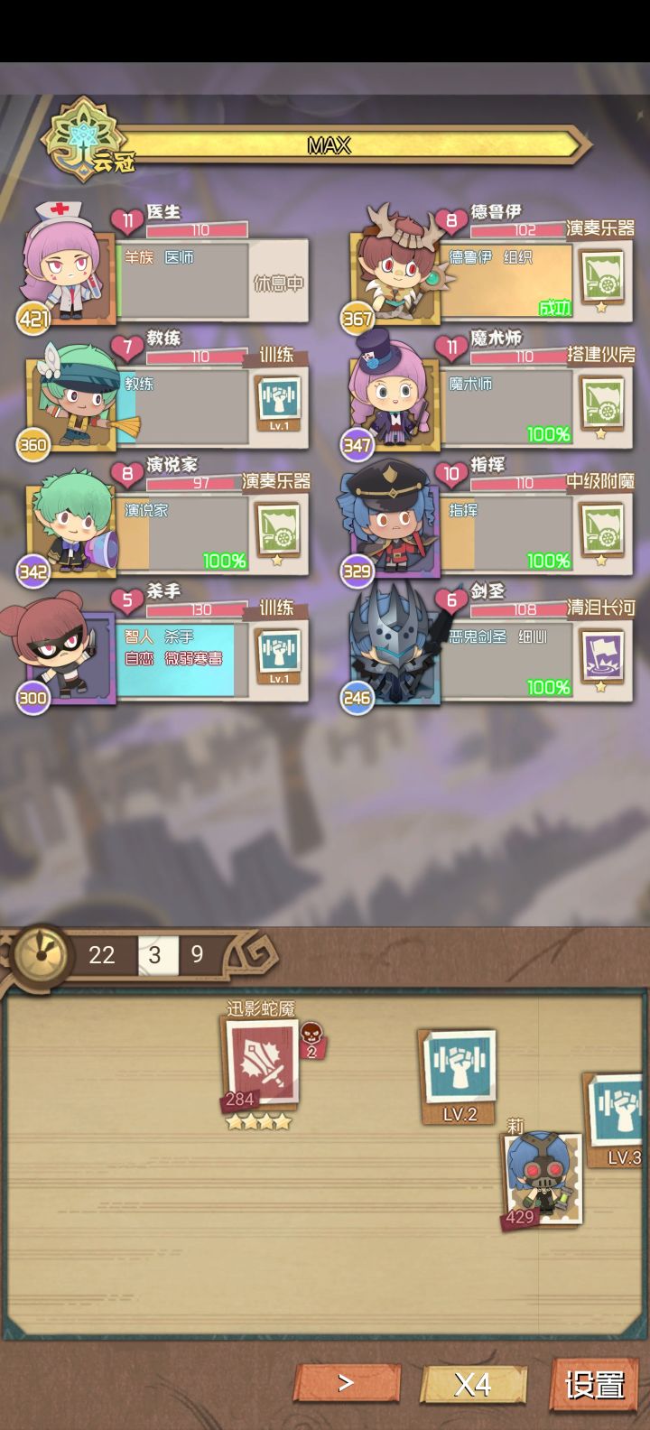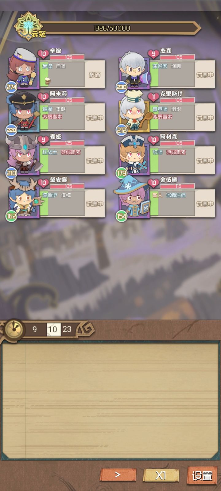 4.一定要有一个指挥,一个演说家,两个参谋或德鲁伊,其他的一个奶妈(牧师个人觉得还行,毕竟是复活,前期可以用医生奶量足一些),剩下的随便(最好是一些技能是输出的),这样打boss时可以无限续技能(演说家把所有的人都变成技能读条,指挥把所有的技能加30%,德鲁伊或参谋一直复制指挥技能,那么一回合就能打出一个演说三个指挥无限续)