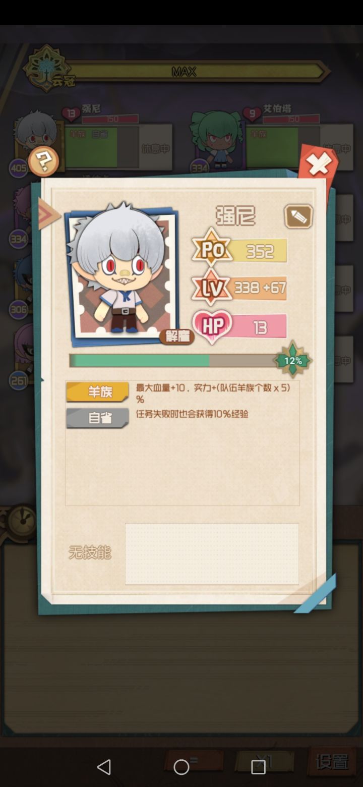 技能统计与推荐加粗的为实用天赋 可以着重看一下个人类晚成的:每年结算时30%概率个人天赋+1麻利的:任务完成速度加快10%极速的:任务完成速度加快30%执著的:任务成功率大于30%时 个人任务失败后 会自动再尝试一次固执的:个人任务失败后 会自动再尝试一次谨慎的:不会接受成功率小于50%的任务勇敢的:面对有危险的任务时,成功率翻倍稀人:升级概率+5%逆天的:升级概率+10%洗