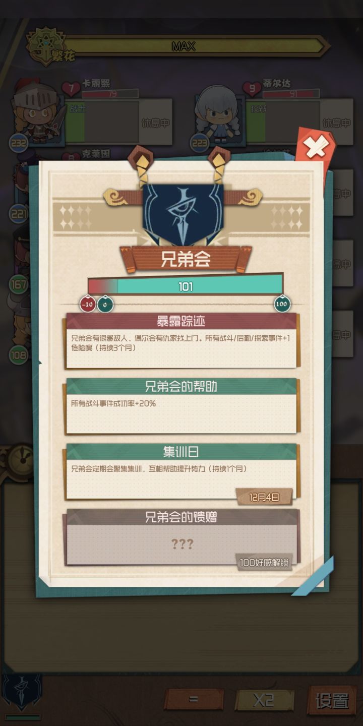 3.推荐增加可以查询的属性值,当前我只能知道我招募的人的几个属性,比如寿命,等级及等级上限,血量。我游玩过程中不止一次的点到我的雇佣兵上想看看5级的训练可以加多少属性,攻击力只有在战斗的时候看卡大概能知道,然后速度也只能通过战斗中读条速度推测,建议攻击和速度可以在常态下看得到。