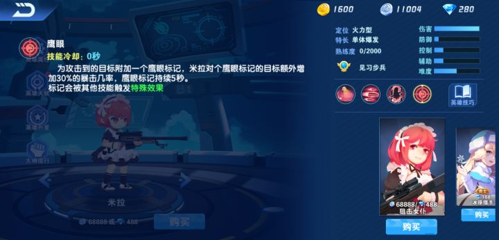 一、英雄背景:国家-数据删除-局精英特工,现接到一个潜伏在**街,寻找一个秘密组织的总部,平时经营着一家女仆咖啡店掩饰身份,毕竟谁能想到咖啡里的萌妹女仆是一个能拿到重狙的特工呢。二、技能介绍狙击女仆—米拉是一个超远距离射手,可以释放无人机锁定目标,并利用远距离的射程精确打击目标,一击毙命。l 被动:l 技能一:l 技能二:l 技能三:PS:全部技能效果及表现以实际游戏为准