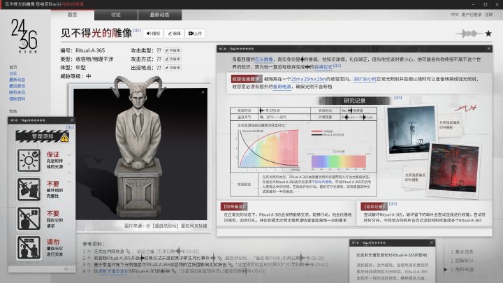您正在访问 隐秘档案馆>怪物wiki权限验证成功,资料已调取,请查看>>>┃Ritual-A-365-见不得光的雕像————————害怕光线的石头雕像……[展开↓↓↓]攻击类型:??[待编辑]攻击方式:??[待编辑]出没地点:??[待编辑]该密室原体已被捕获收容,收容回执单已上传,点击图片即可查看,摘要如下:造成海恩中学某学生意外事件的密室原体,外型为石像,因为其具有畏光性,故又