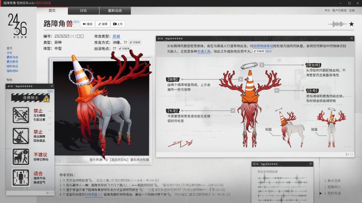 您正在访问 隐秘档案馆> 怪物百科wiki 权限验证成功,资料已调取,请查看>>>┃路障角兽 ————————头似路障的鹿型密室原体......[展开↓↓↓]出没地点:[暂无人编辑]攻击方式:[暂无人编辑]自救贴士:[待用户补充]若您是目击者或有更多相关信息欢迎 [编辑] / [上传] 以补充该词条如无法点击请直接在评论区中进行留言,No.X会对关键信息进行爬取和甄别,同时此条动