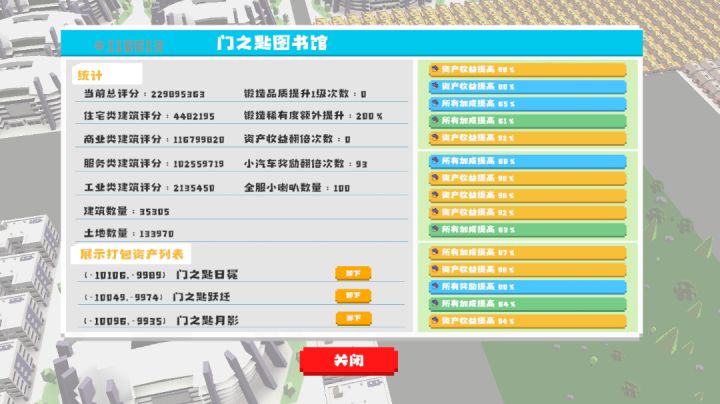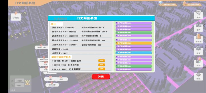 当前版本针对萌新而言,开局应建3个450金币的建筑或买3个价值500金币的地皮,然后分别对其进行资产打包(资产打包点击编辑页面进行)完成打包后,点击打包资产对其进行词条锻造,锻造3个小车数值(并非百分比)奖励的词条后就可以通过刷小车賺钱了。关于资产评分,一个种类的建筑里,最贵的就是评分性价比最高的(服务建筑88万的体育场,商业建筑26万的大楼,工业建筑15万的发电厂和自来水场,住宅建筑660