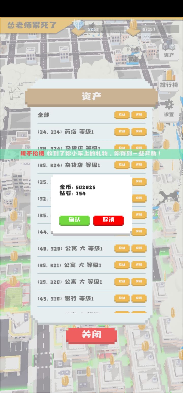 首先说的就是金币和钻石,刚开始主要就是点车,(点击一个车不松手滑动屏幕可以继续点)钻石前期可以造一些银行,等到有一点钱了可以造一些酒店加油站来得钻石。得金币可以造摩天大楼。