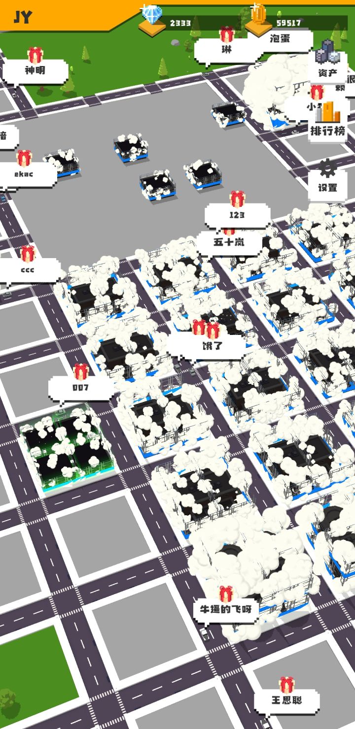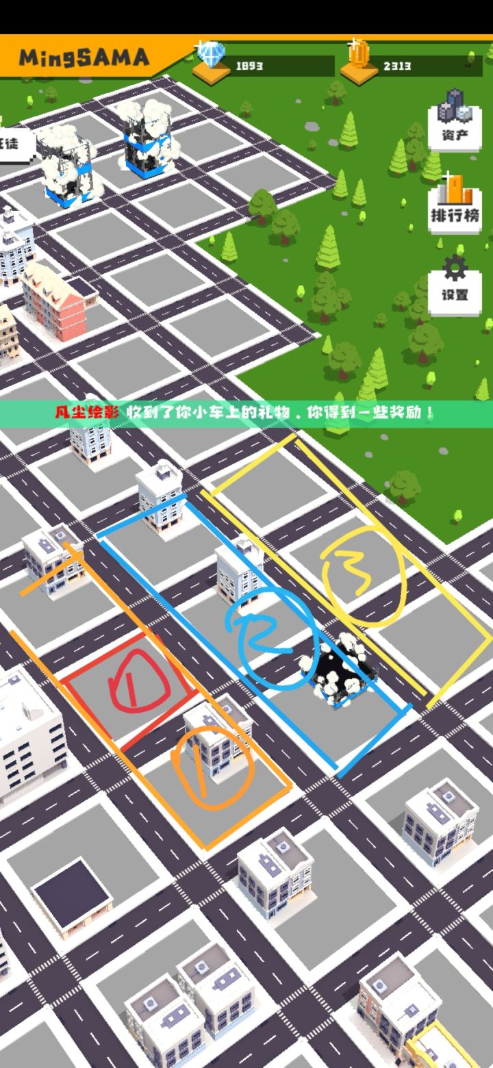 因为游戏是根据每街区划分3X3范围内的价格涨价的,初期地皮在5000左右,所以市中心地带动辄上万的地皮甚至是大于六千的地皮是不建议大家购买的,所以对于想有规划的建设的同学们建议在初期最边缘空地购买一个街区(如图1区),然后向左右根据自己喜好左右扩展一个。因为地皮会根据街区建设建筑自动延伸,但购买地皮并不会延伸地皮。所以根据这个特性,最好在最初地皮建好建筑后立即购买一格的街区地皮(如图2区),在一