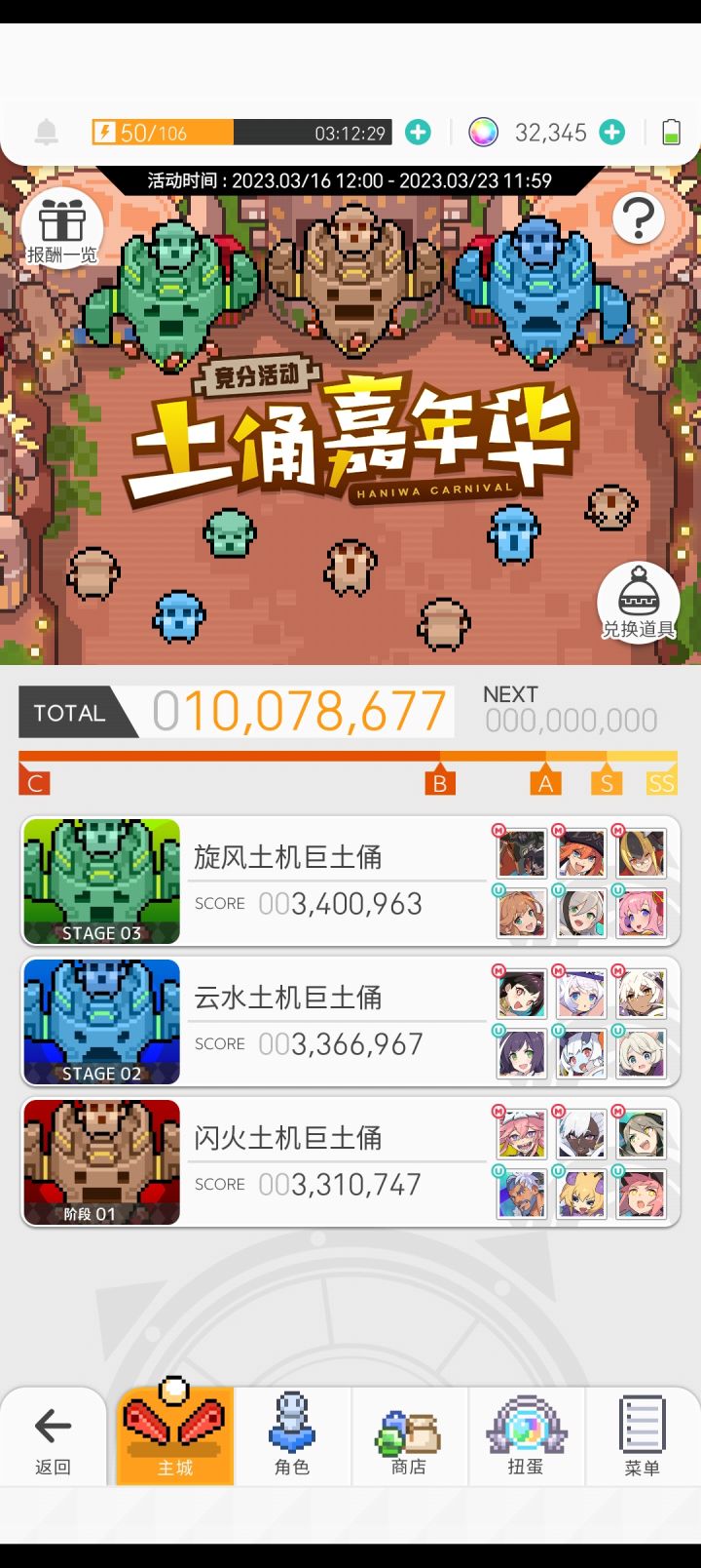 两三天凹分凹到凌晨一两点,终于把奖励拿全了除了风土俑的火狼低配减C盘是没有合适的攻略视频可以嫖,纯一点一点抠出来的细节分(大致手操思路可以比对剑PF盘,我尝试录频如果能录出来凹到345w+的我就传B站),另外两个盘B站都可以搜到相同高配配队给像我一样五星破晶、六班素材自己限定角色都缺的弹友一点信心,哪怕角色不够,练度不够,也能想想办法凹到全奖励