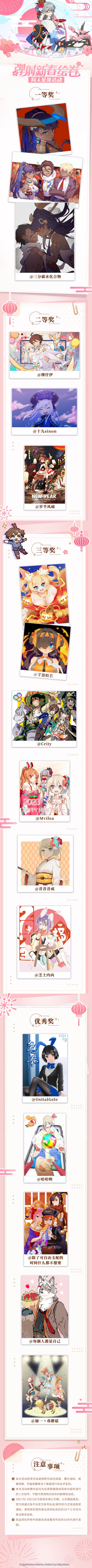亲爱的冒险者:感谢您一直以来的支持与厚爱。世界弹射物语新春绘卷同人征集活动圆满结束,感谢各位冒险者的关注和支持! 以下是本次活动的获奖名单: 【一等奖】 三分碳水化合物【二等奖】 缪仟伊十九sinon岁半风疏【三等奖】 芋怨般若CrityMvilea昔昔昔成芝士内向【优秀奖】OsitalGele哈哈哟除了可自由支配的时间什么都不想要每個人都是自己加一丶毒蘑