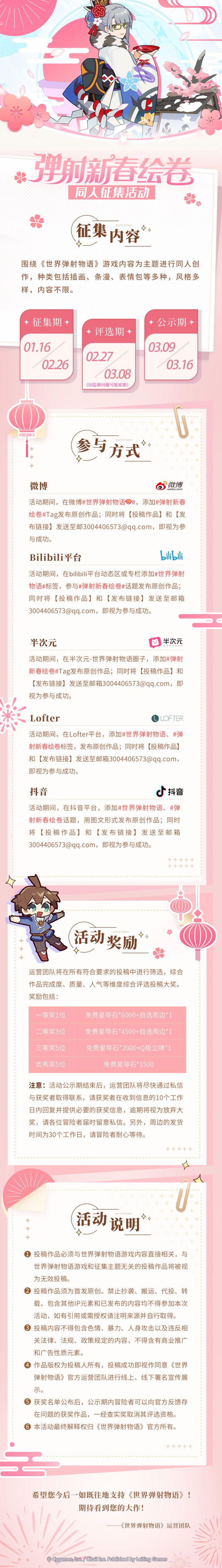 《世界弹射物语》新春特别同人征集活动即将开启! 1月16日 ~ 2月26日,只要投稿即有机会获取官方周边、免费星导石等丰厚大奖,期待您的大作! 【征集内容】围绕《世界弹射物语》游戏内容为主题进行同人创作,种类包括插画、条漫、表情包等多种,风格多样,内容不限。 【征集时间】2023.1.16 - 2023.2.26 23:59 【参与方式】 投稿方式及活动详情见长图。