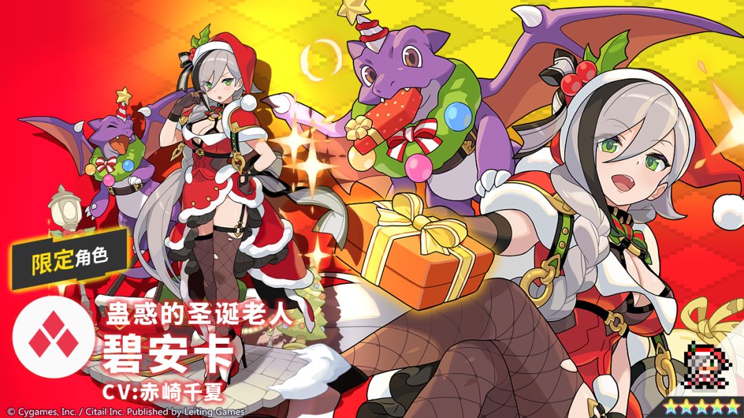 具有女王气质的召唤术士,最讨厌圣诞节和小孩子。这次她打扮成圣诞老人,将向孩子们分发爱的证明(礼物)。不过她也明白自己的行为再差一点就会对孩子们产生不好的影响。✦ 属性:火✦ 类型:辅助✦ 技能:圣诞之息以龙之吐息对领域内全体敌人造成火属性伤害+赋予火属性抗性降低+攻击力降低效果“给我跪下吧?这可是女王大人给你的礼物哦,呵呵呵。大概是……这种感觉吗?诶,不对吗?”「新角色特选扭蛋」限