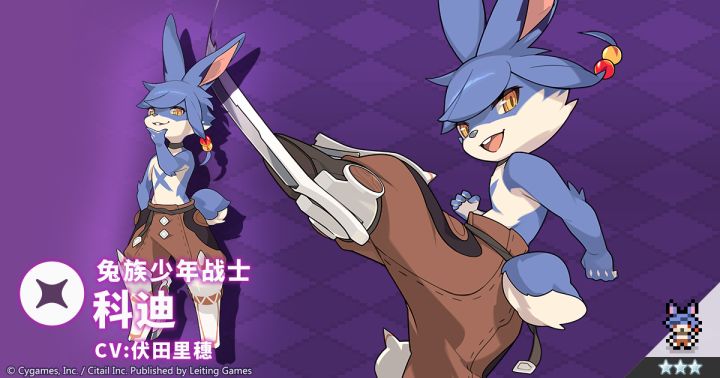 以牙之世界的最强者为目标的年轻人。虽然生为弱小的兔族,但那双经过无数锻炼的脚能使出无比猛烈的踢技,能够轻而易举地击倒寻常的犬族猫族。✦ 属性:暗✦ 类型:格斗✦ 技能:闪光刀锋向前方突进并不断使出锋利的踢击,对命中的敌人造成暗属性伤害/赋予自身攻击力提升效果“我叫科迪。小瞧我的家伙已经全部被我铲除了,今后我也只会继续同样的事而已。”「新角色特选扭蛋」限时进行中!