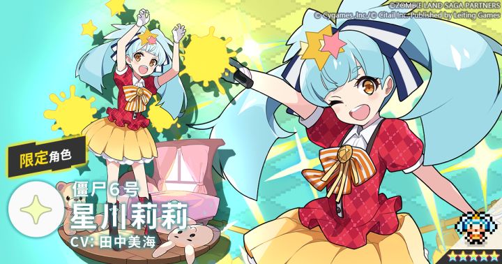全员都是僵尸的佐贺当地偶像组合·芙兰秀秀的成员。达成了全频道黄金时段主演的天才童星。虽然年幼但职业操守很强,一心只想着如何让自己变得更可爱。最喜欢支持自己演艺事业的父亲。✦ 属性:光✦ 类型:特殊✦ 技能:莉莉的亮闪闪攻击!以可爱的举止动作对全体敌人造成光属性伤害(不破坏弱点)/赋予全体队员攻击力提升效果“我是僵尸6号,星川莉莉哦,请多指教啦!竟然能来异世界,简直就像是动画片一样啊~♪