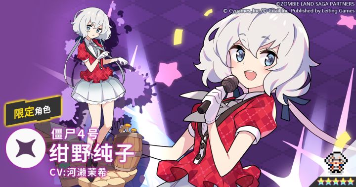 全员都是僵尸的佐贺当地偶像组合·芙兰秀秀的成员。引领了偶像热潮、风靡一世的传说中的昭和偶像。芙兰秀秀中唱功最好的成员,但并不因此自负。永远认真对待偶像事业,是个自我要求非常严苛的人。✦ 属性:暗✦ 类型:特殊✦ 技能:偶像的光辉以精彩的表演俘虏电视机前的所有粉丝,赋予参战者全员技能伤害提升效果/发动时若生命值不满45%,追加赋予暗属性角色屏障“我是僵尸4号,绀野纯子。说实话这里尽是些让