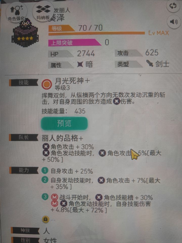 白嫖的人物葵泽真香。。可以尝试组一组暗踢罐了。。技能还没点满,点满应该是50%,很猛的暗队充能