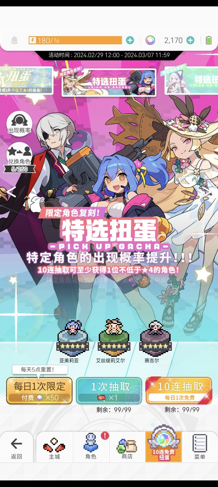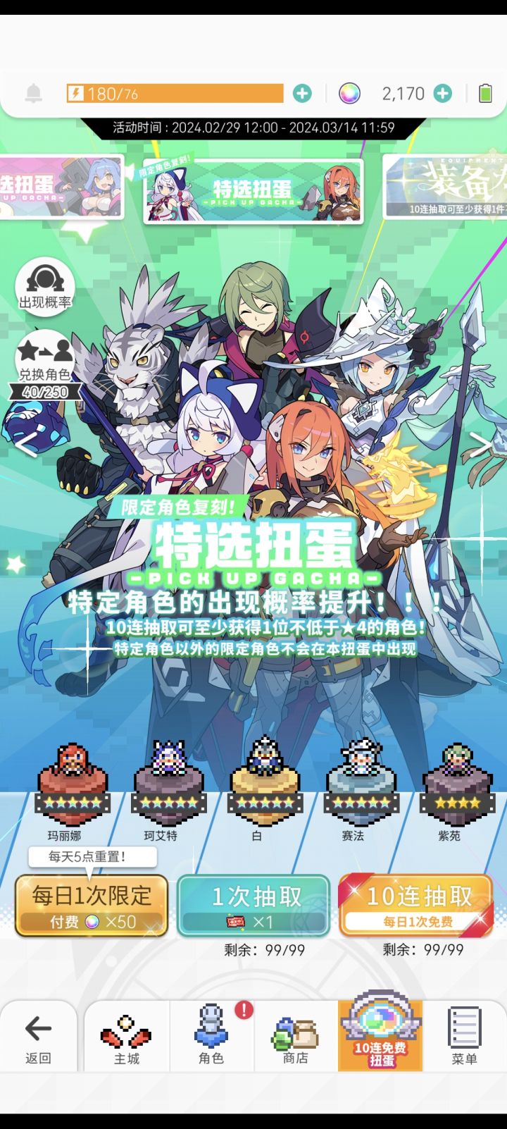 1.5复刻池三个人都没有,2周年池抽到了星猫和船长,另外两个没有,不知道免费十连抽啥了现在有光技伤队,水队主要靠送的龙拳,其他队都没整