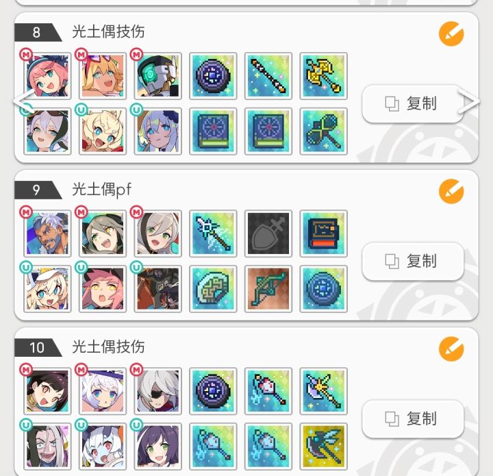 一周年萌新开始备战光土偶(上到下依次为技伤 pf 直击盘)pf盘第二个装备为羁绊拳,面包队珠子全暗面包杖(打活动还没换)