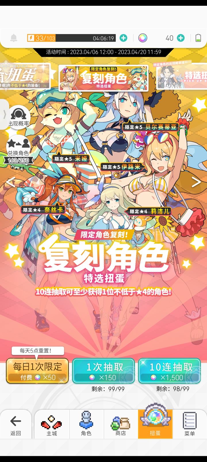 130抽一个暗魔女,之后看角色剧情抽到150啥都没有,然后再看一次十连直接出全,谢谢你,弹宝郁闷的心情一扫而空