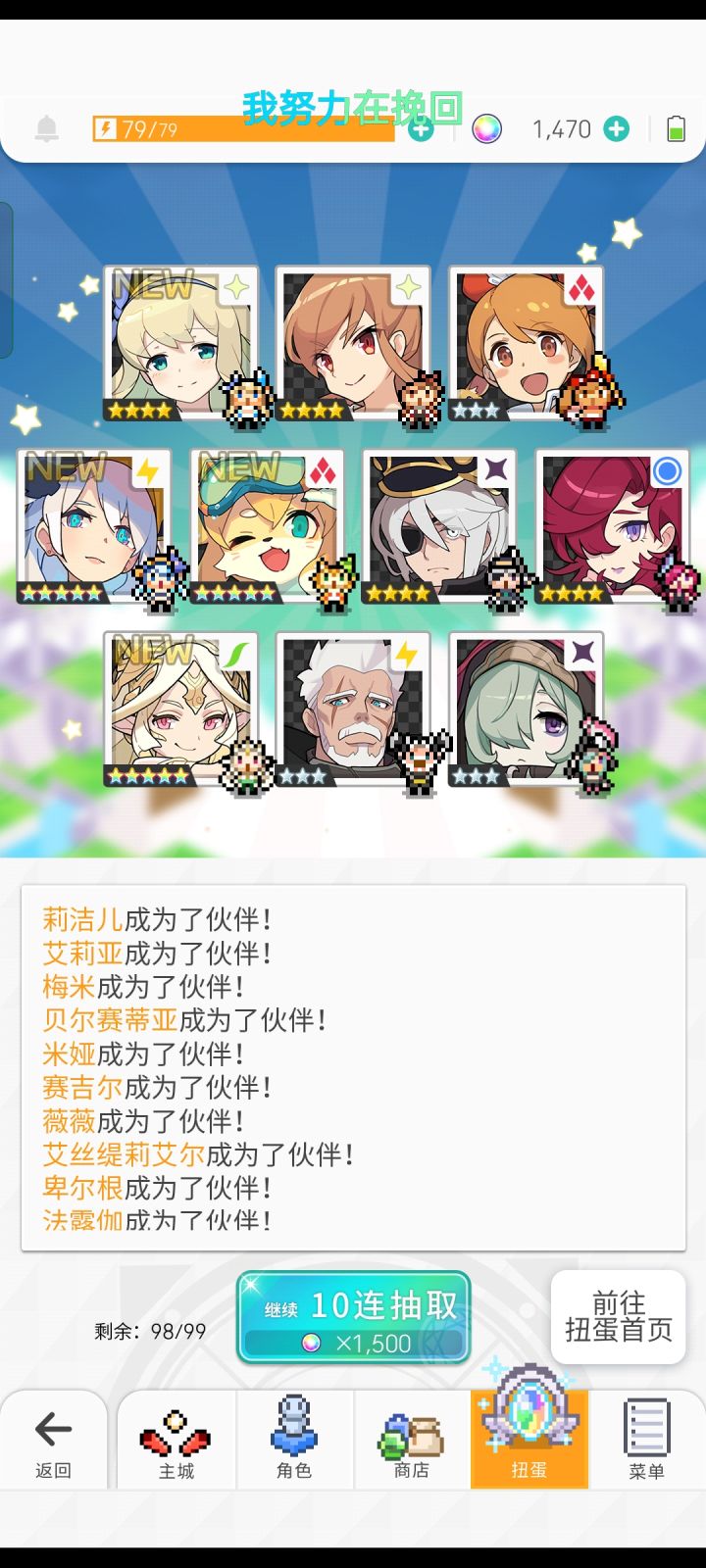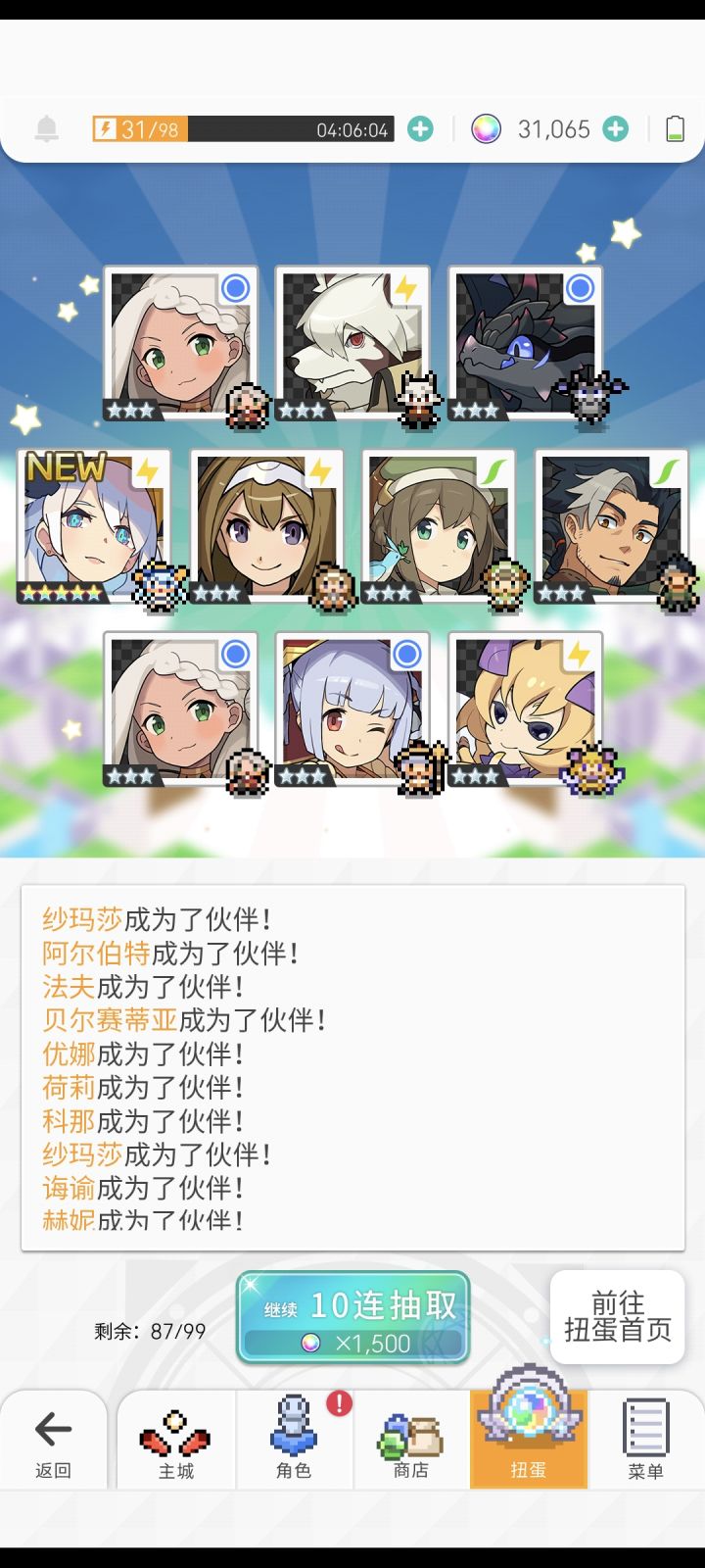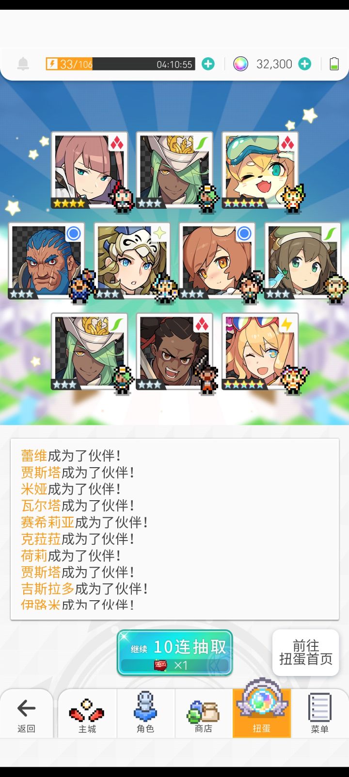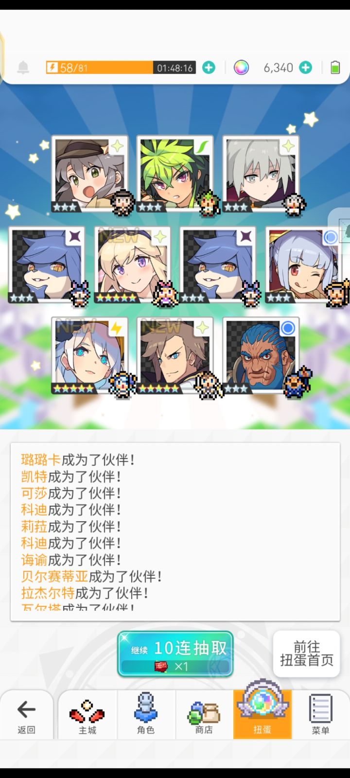 我天,10抽就结束战斗本来只有6400个石头和两张十连卷,想着捞个五星算了,结果直接出了,还十连三彩🙆。