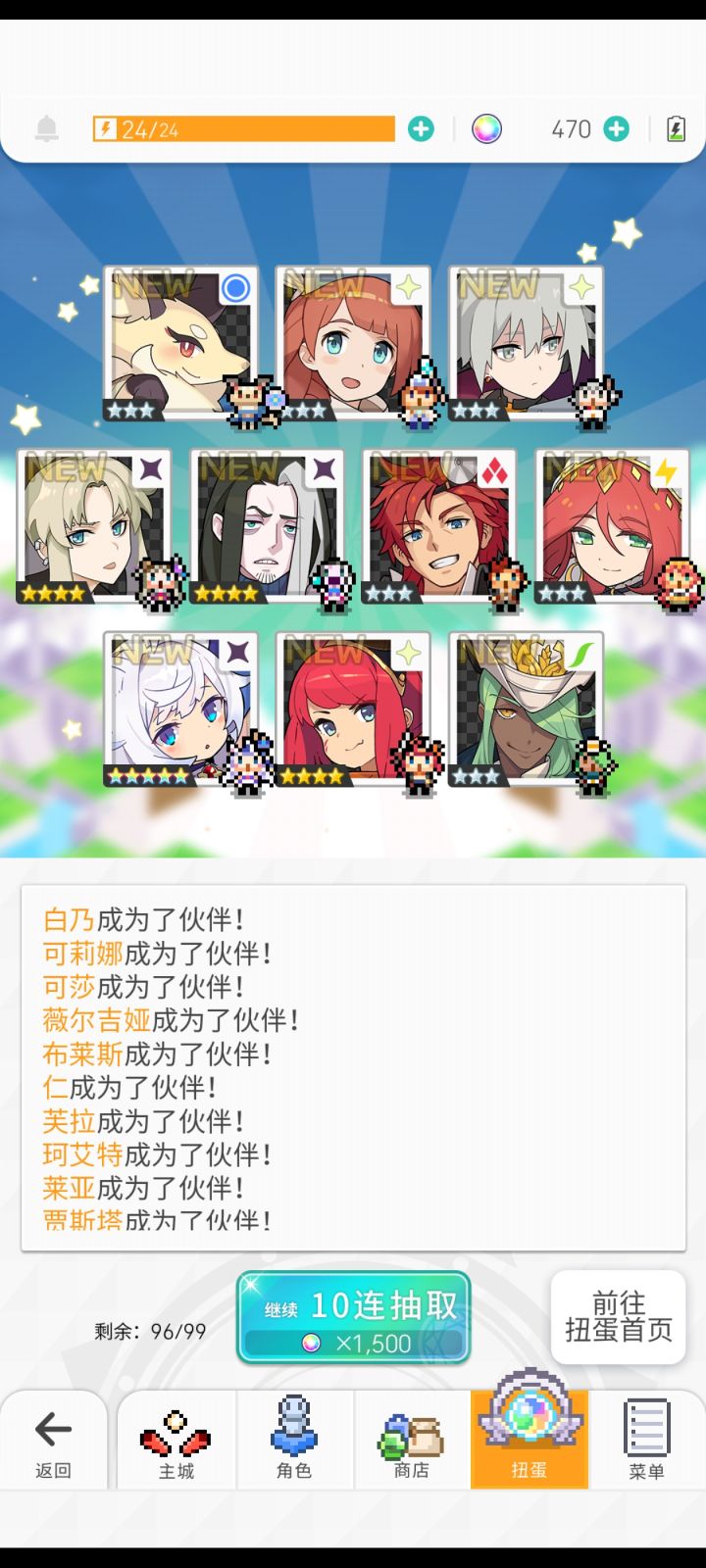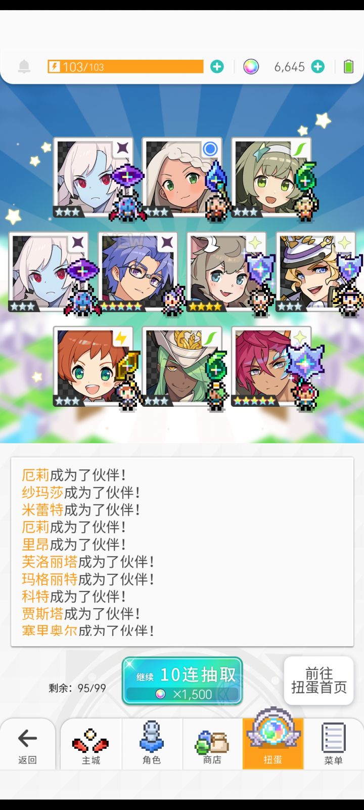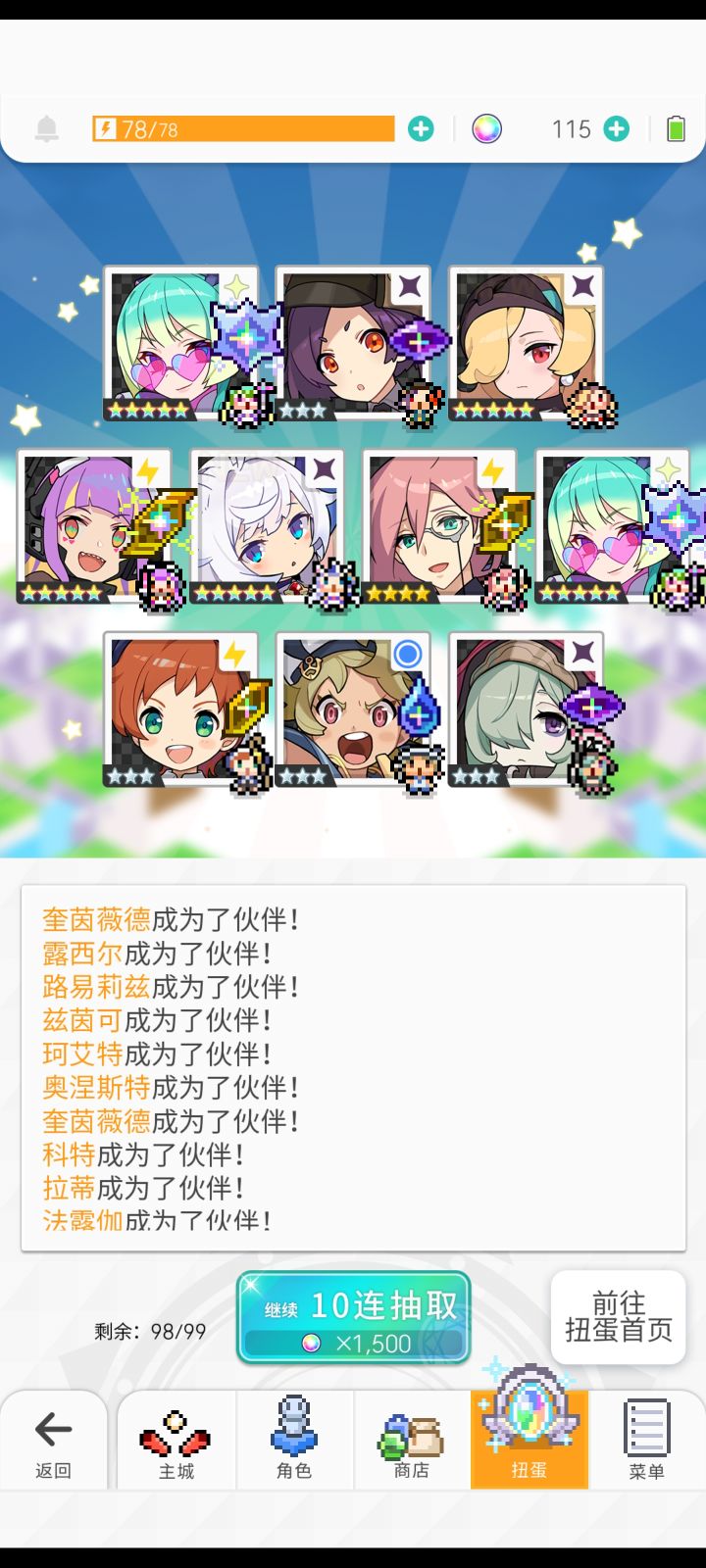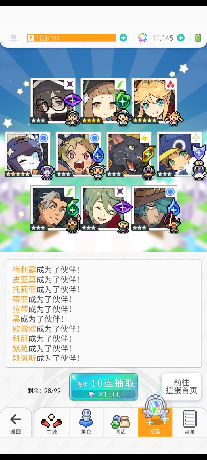 1.5周年入坑,玩了快一年了,开个游戏记录帖子。目前在玩6个号,主玩两个号(月卡和25元付费石头礼包)。用一号和二号来取名吧。一号是从一个弃坑玩家(后来发现是老乡)手里买的,二号是初始号(5万石头+礼黑星奶星七星忍)开局。太久以前的抽卡记录都忘记了,贴一下最近的抽卡记录。一号雷魔女池子 250抽吃井泳02池子 20抽狗拳池子 243抽 狠非二周年三限定池子 210抽 春魔女、春圣和虎神将