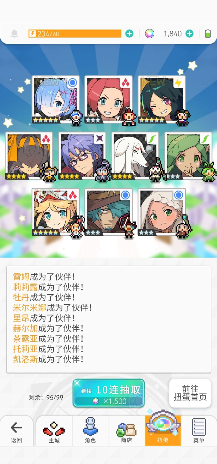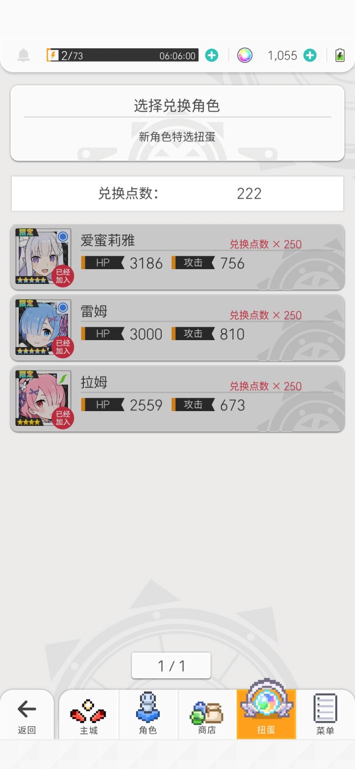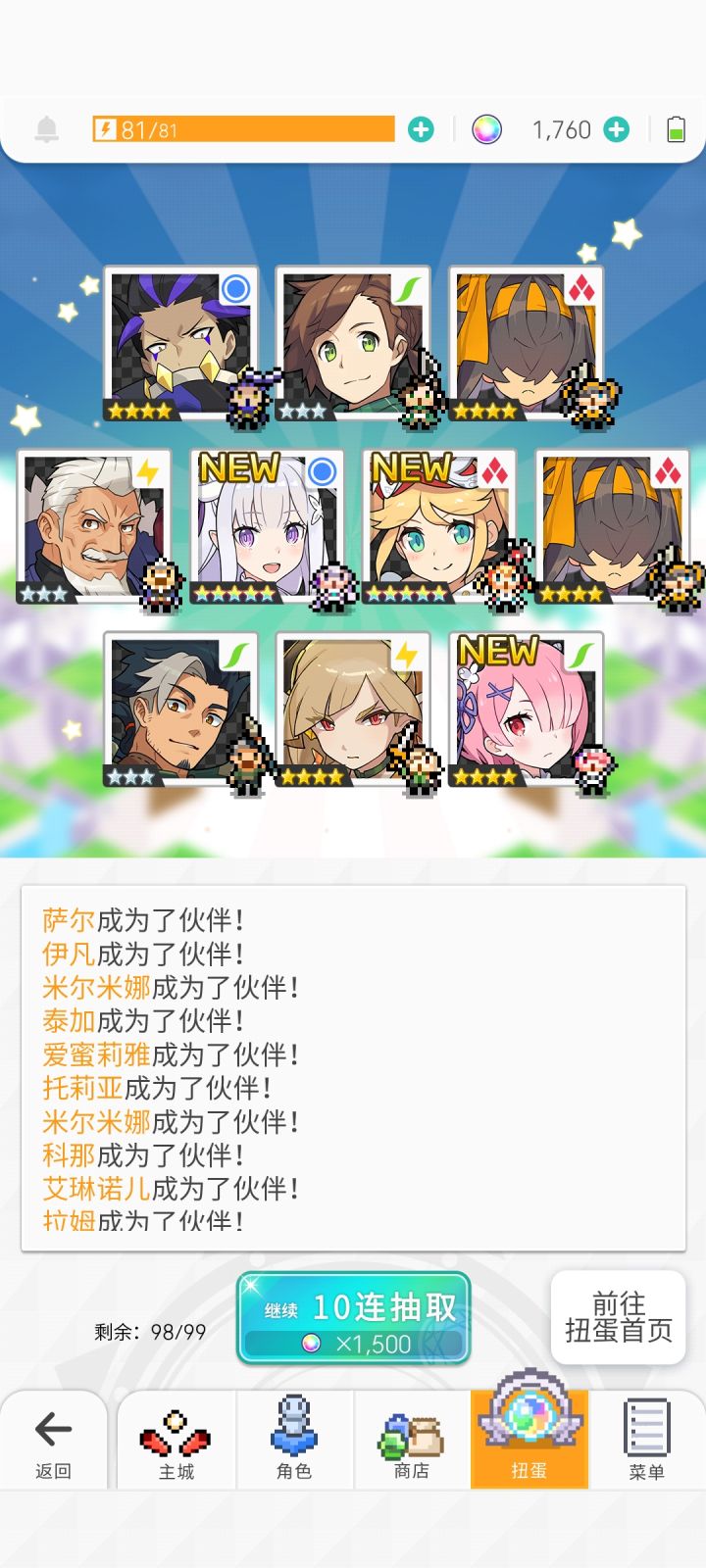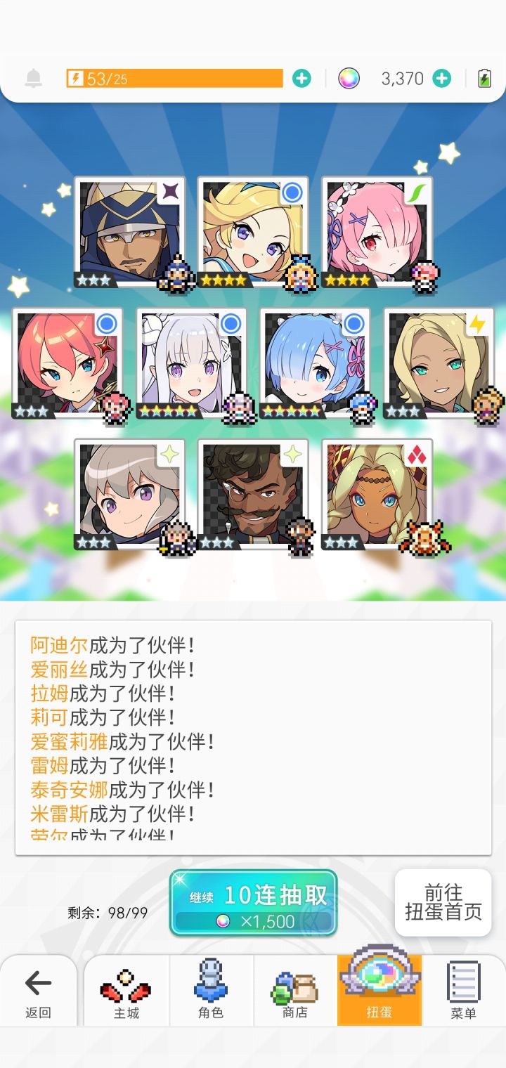 今天下午耗完了最后一颗石头,蕾姆爱蜜莉雅一个没出。刚才超得了水碳,抱着最后一丝希望用超得送的十连抽了一发。出了!弹宝我爱你