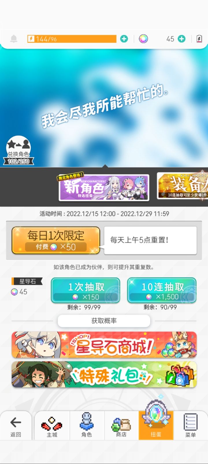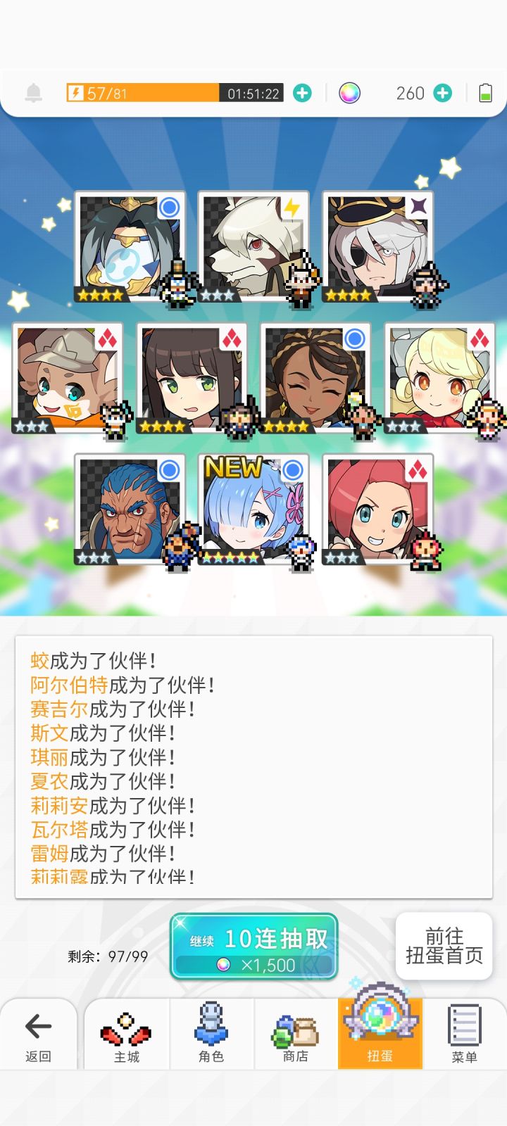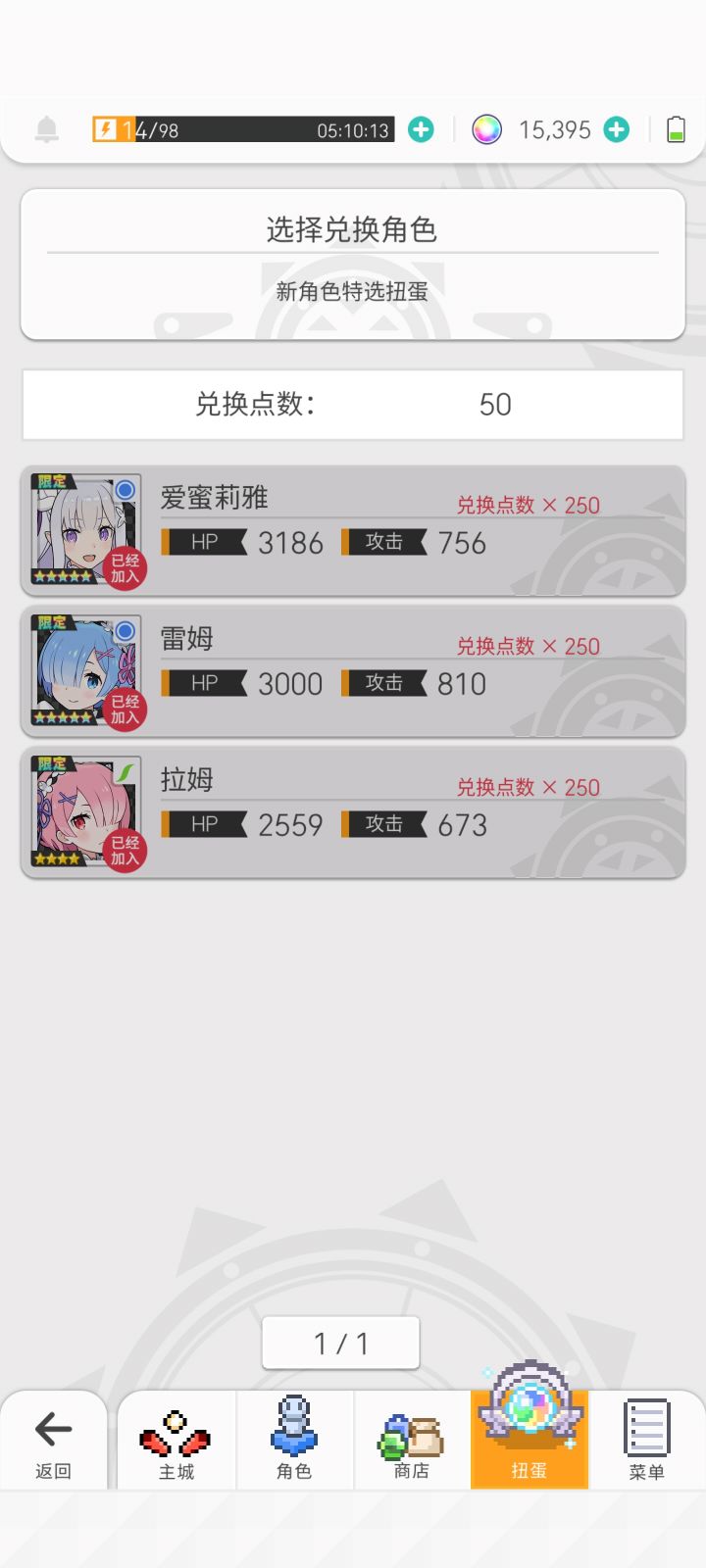 今天下午耗完了最后一颗石头,蕾姆爱蜜莉雅一个没出。刚才超得了水碳,抱着最后一丝希望用超得送的十连抽了一发。出了!弹宝我爱你