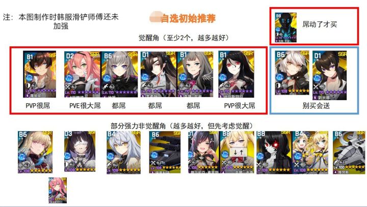 带坏小孩子系列-萌新入坑选卡教程#(滑稽) 懒得看字的萌新直接跳过此文,直接查看这两页推荐角色。本教程仅仅解决国服现有卡池配装问题。不解决现在不存在的未来卡池问题。本教程主要适合0氪金,金色角色少的萌新。若果金色角色足够多就自己看看哪些最有用来优先培养。正文:这是个团战游戏,玩到40级也就半个月的时间,萌新要在半个月里培养出20-32个100级角色。请以32个百级角色为目标进行培养。初期