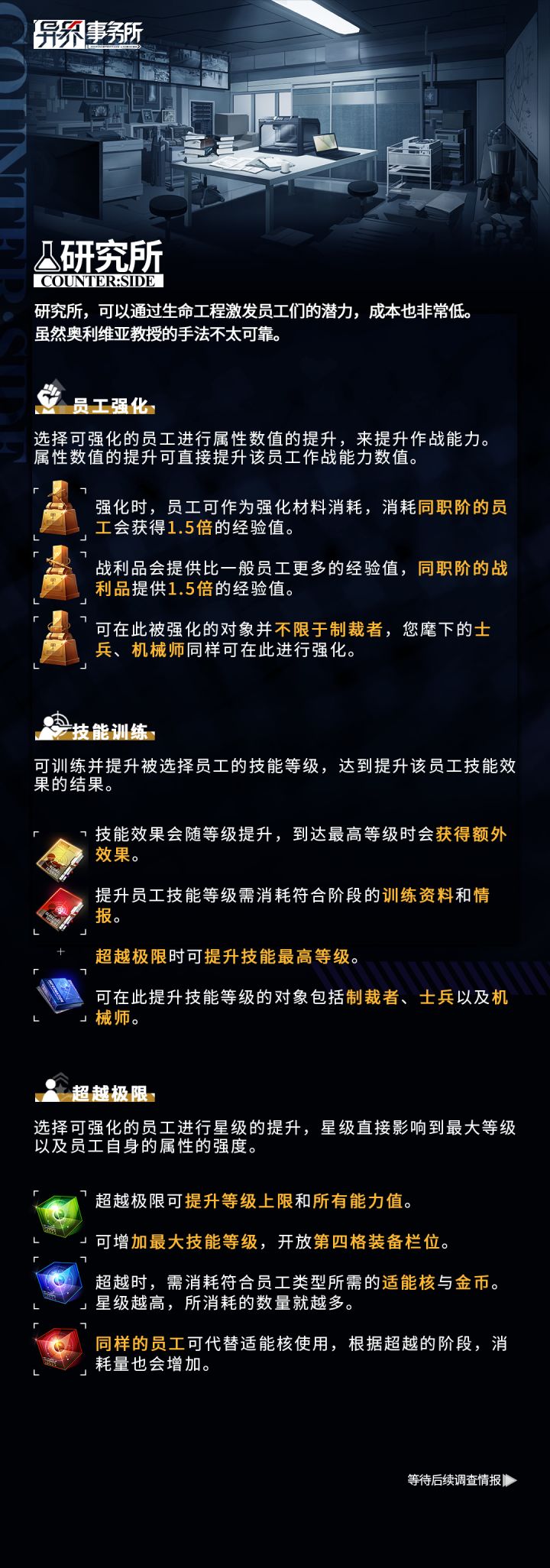 那个……老板。几天前我听到个别制裁者抱怨关于劳动强度以及待遇的问题如果您也听到类似的传闻,请您不要介意科芬公司是一家在管理局注册过的正规的民间军事公司,业务范围极广同时我们非常关心员工们的成长“研究所”就是为成长关怀量身打造的可以供员工提高自身战斗能力设施经过研究所洗礼……不,锻炼过的员工在下次的战斗中都有明显的成长今次就为您提供关于研究所的说明书您一定会认为,里面的设施的确