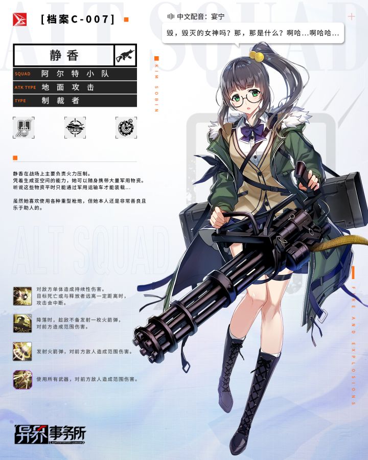 阿尔特小队亚空间能力者向你报道 静香在战斗中负责火力压制,找准位置后,她会输出极其可怕的火力。她还拥有生成亚空间的能力,有了这个能力可以随身携带大量军用物资。她在地下世界中是很特殊的存在。没人能将单纯善良的静香与血腥的雇佣兵联想到一起,有人猜测静香是因为与某人的情谊而加入。 静香 中文CV:宴宁技能展示(本素材内容仅作展示,具体请以游戏实际情况为准)奥义展示(本素材内容仅作展示,具体请