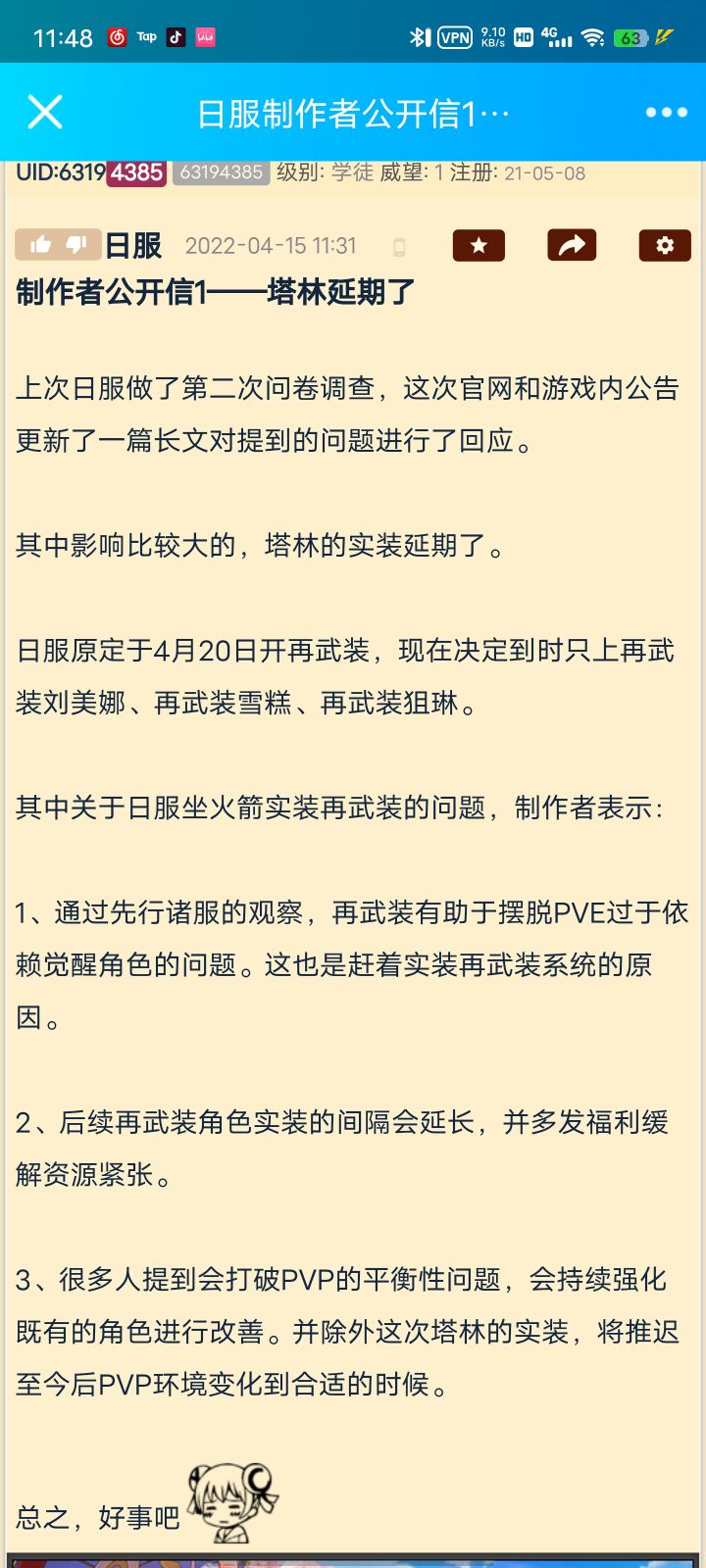 日服牛批,出再武装是为了让pve摆脱觉醒角,后续再武装角色间隔延长,多发福利,打破pvp平衡的塔林等环境合适再放出来,牛批牛批
