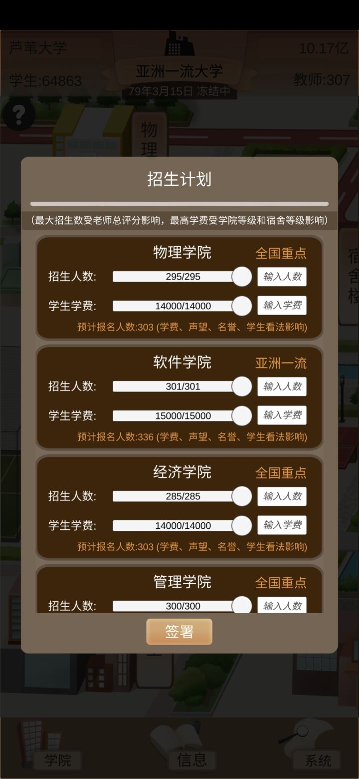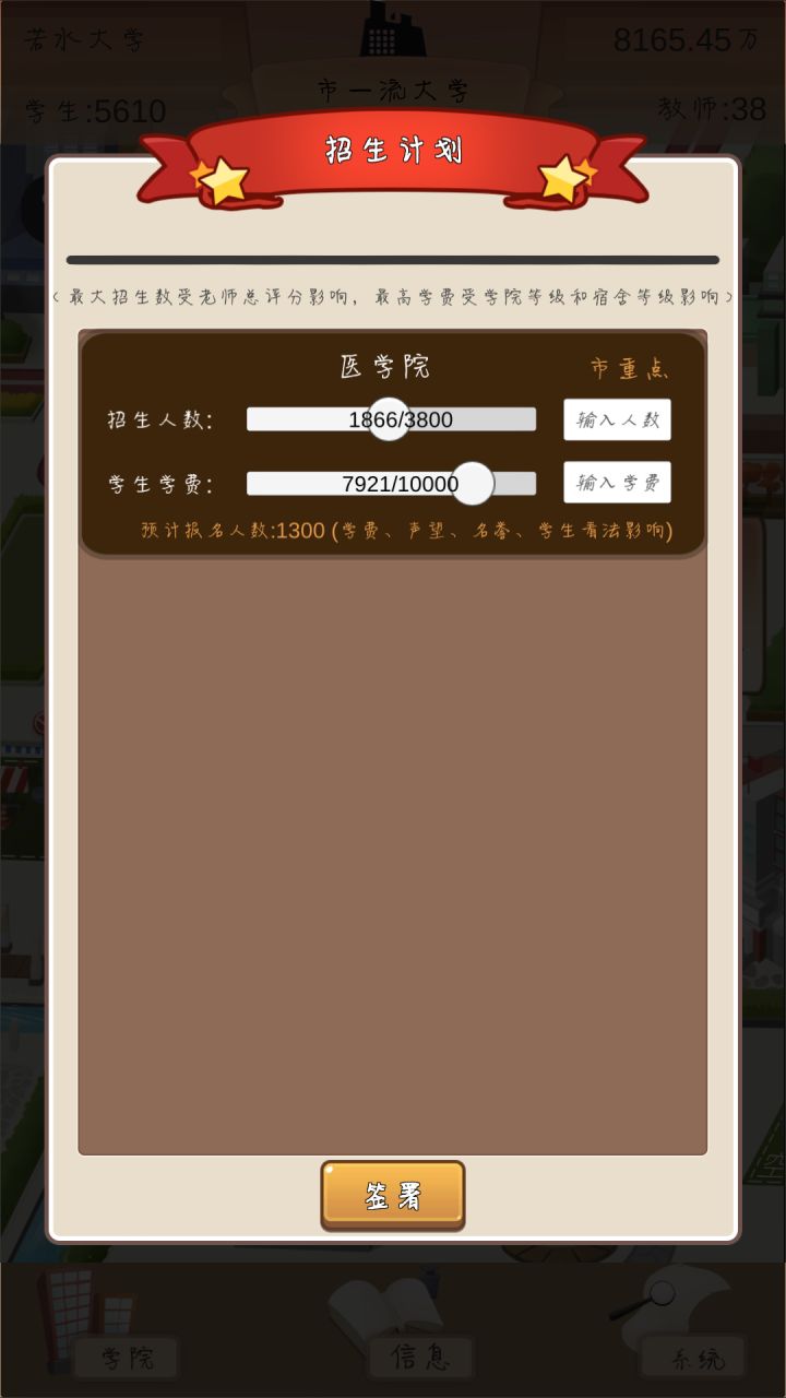1.开局老师别整太多,25左右就够了,不然开销很大,直接招十个副教授,招生数量就很可观了(起始招生基数600(学费10000),学院升级后基数会增加)