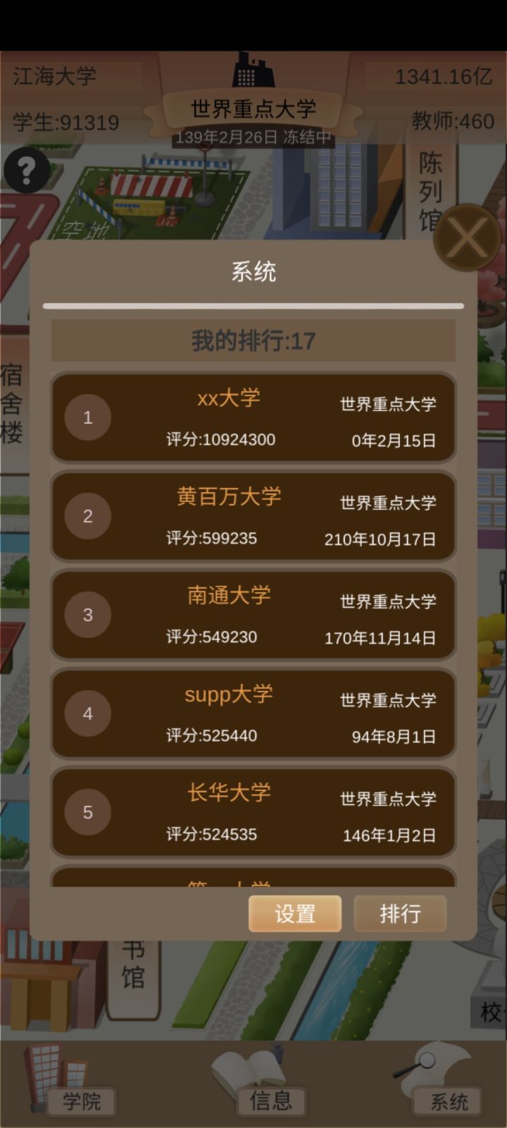 11.第十年十月一日之前记得把校庆打开,校友会能赚钱,前提是你建了校友总会