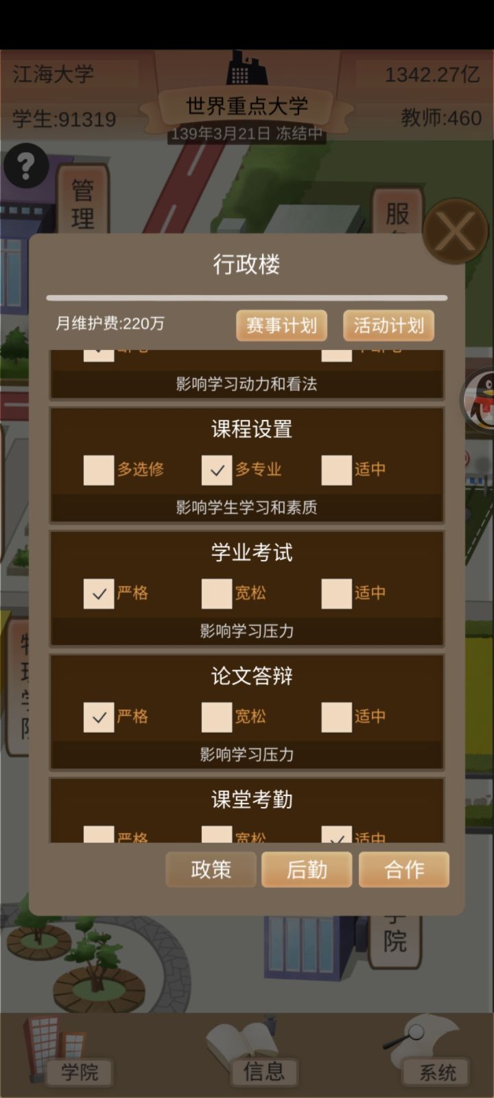 5.政策全部调成对学习有利的一项,国家评测你学校牛皮与否只看升学率(推荐不断电,多专业课,其他全第一项)