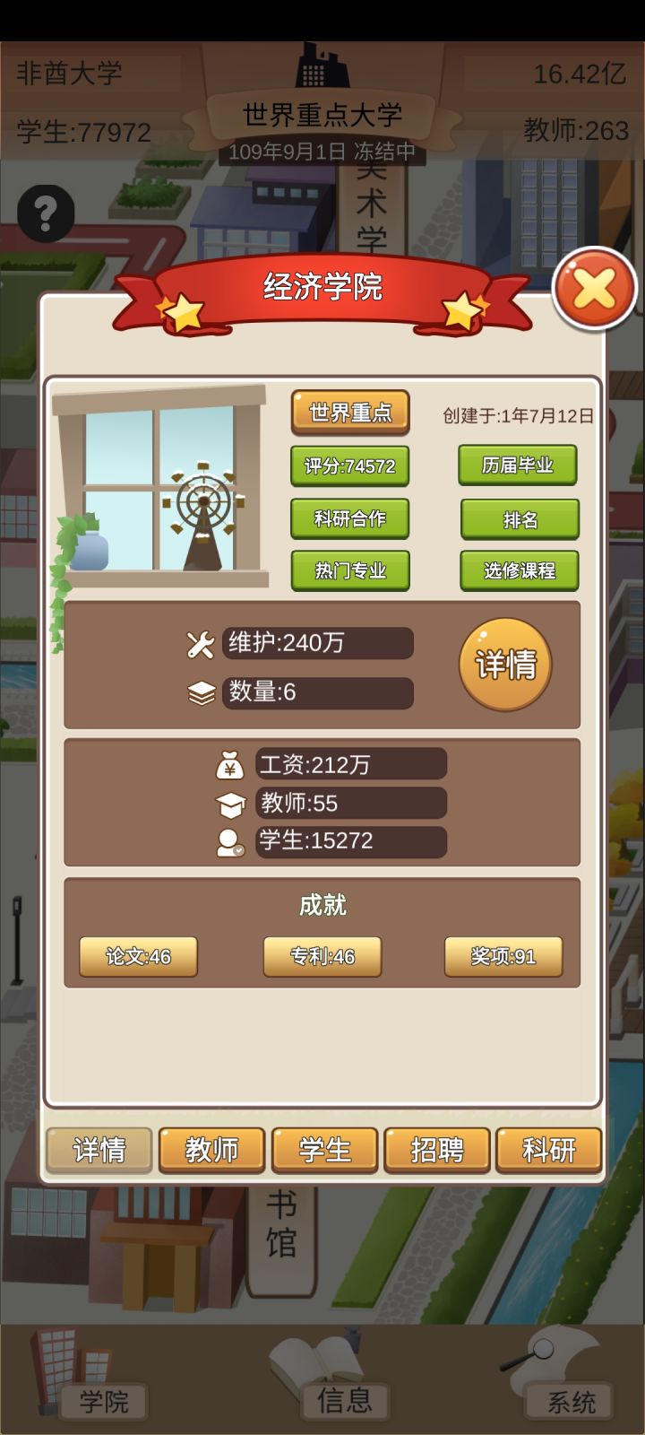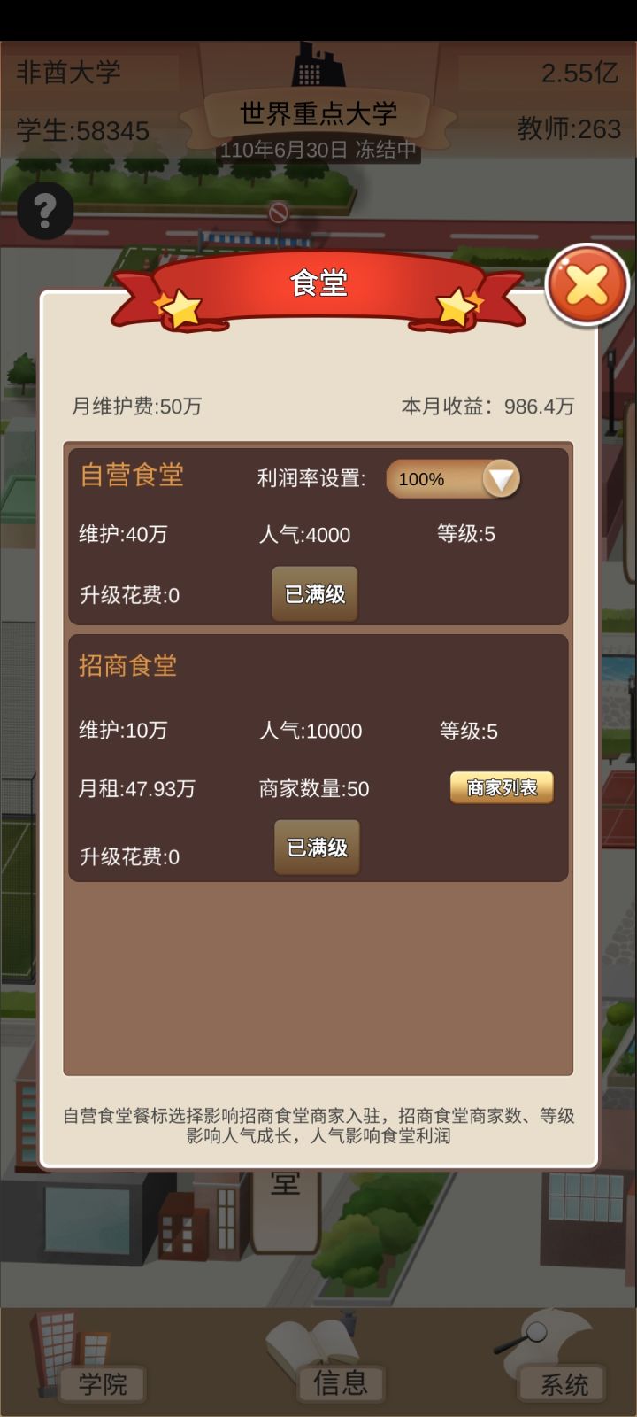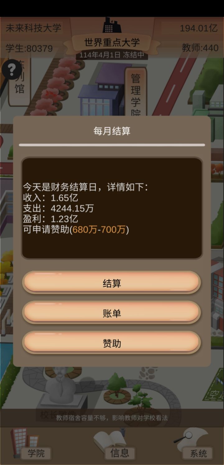 玩了一天的萌新心得:我发现,玩这个,就得心黑,学费拉满,食堂利润拉满,双倍补助,一个学院一个学院的建,全力开发科研去授权,前期几个E级的用来授权,一个月两万多分成,后面的拿来捐赠,涨名望和政府关系;C、D级多少钱记不清了,我现在开发A、B级了(主要是B),一个月几百万上千万分成,加上九级商铺、满级自营食堂和补助,一个月能有几千万。目前才省级一流大学,才建里三个学院,一个是国内重点,一个是国内一流,一个是省级一流,在我没有完全发育起来之前,学校的等级是能卡则卡,毕竟后勤、体育馆什么的,维护挺贵的,这样一年只要看一次广告就好了,基本上每个月都有盈利,发展是慢了一点,但是稳的很。再把奖学金拉满,完全就不会出现学生降级的情况,每年毕业生质量贼高,就业九十以上,升学率二十五以上,工资是平均工资的二倍